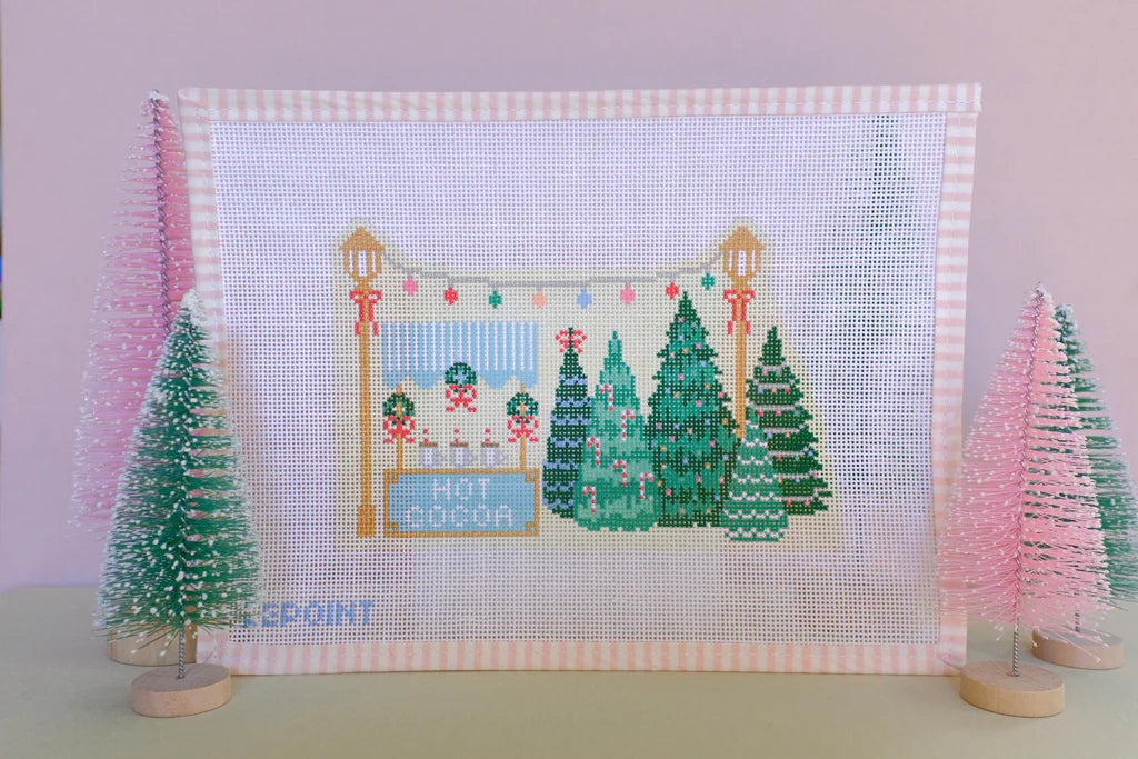 This hand painted needlepoint canvas from the Christmas Village collection by Le Point Studio features a Christmas tree lot.