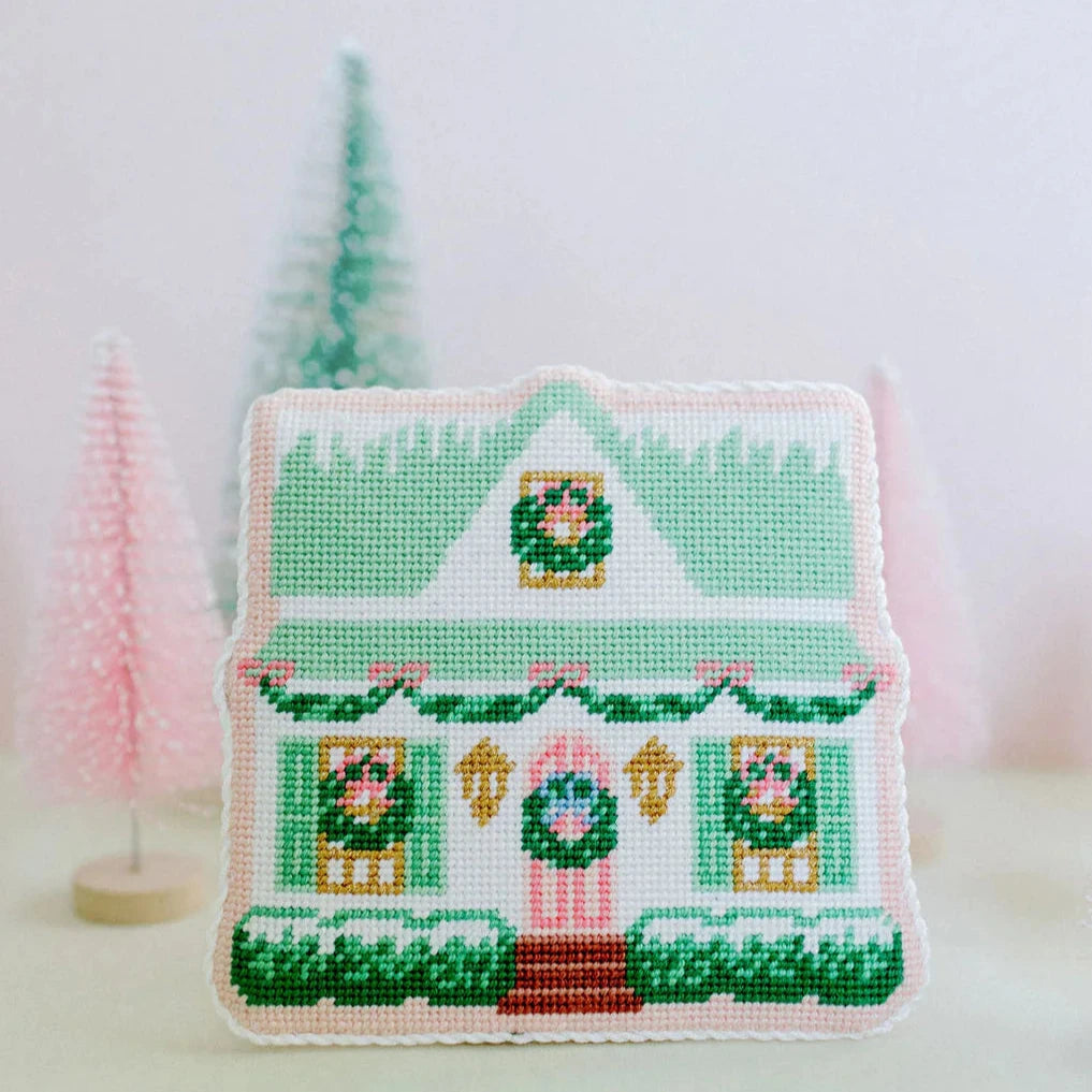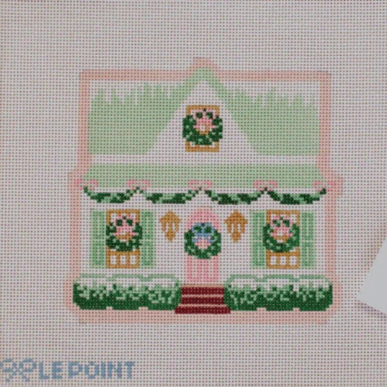 This hand painted needlepoint canvas from Le Point Studio's Christmas Village series features a lovely green house. Finished examples shown for inspiration, materials and finishing services sold separately.