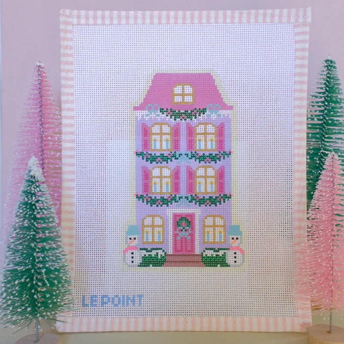 This hand painted needlepoint canvas from the Christmas Village collection by Le Point Studio features a festive purple row house.