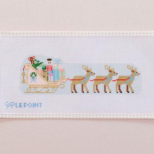 This hand painted needlepoint canvas from Le Point Studio's Christmas Village series features a sleigh full of gifts. Finished examples shown for inspiration, materials and finishing services sold separately.