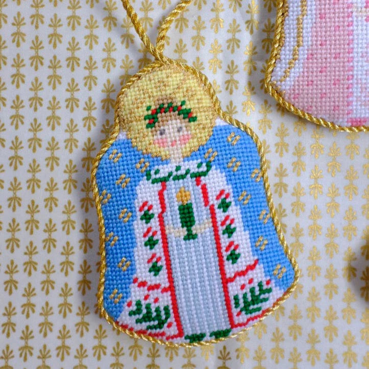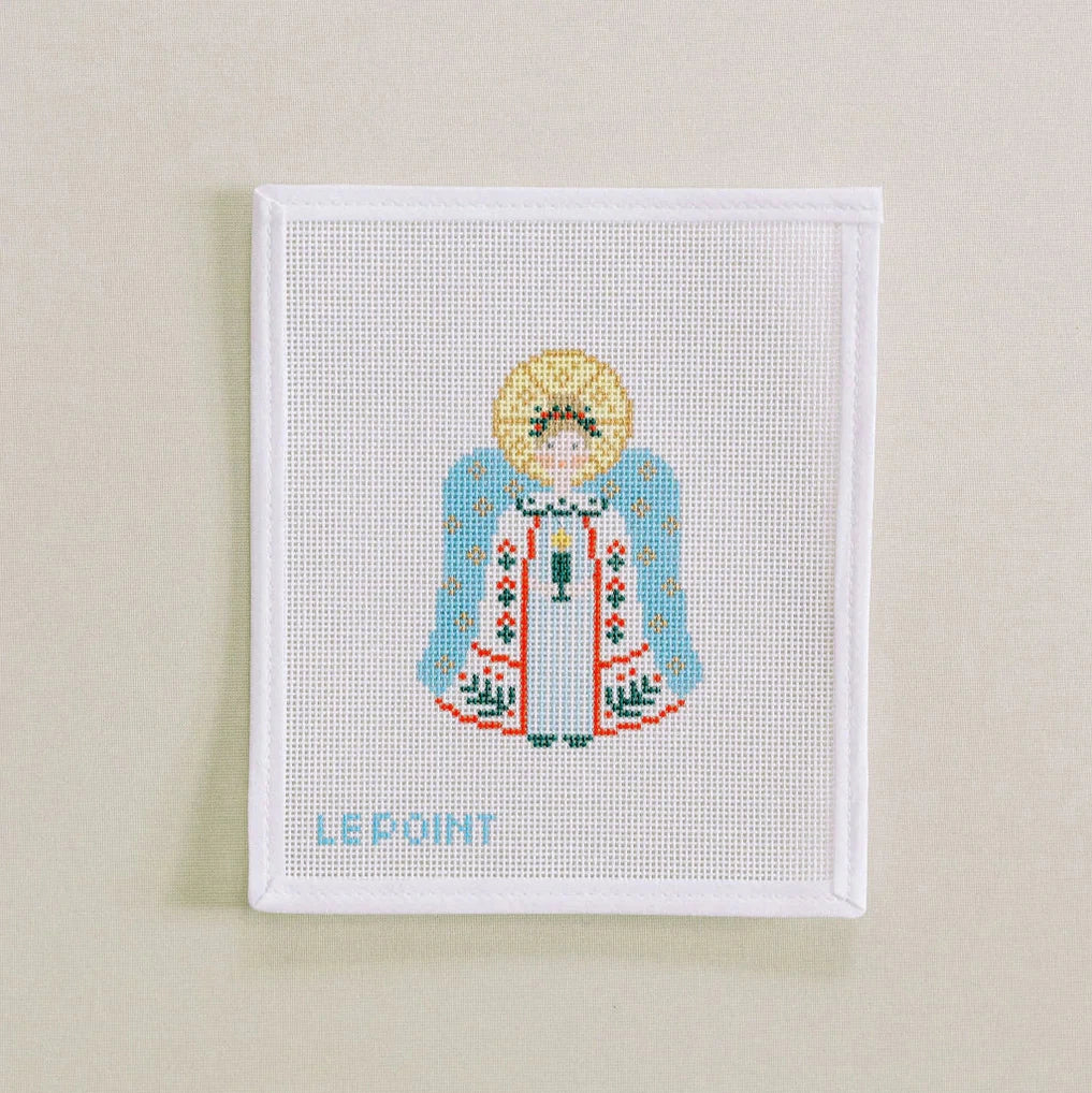 This hand painted needlepoint canvas from Le Point Studio features a pretty angel with holly pattern robe. Finished examples shown for inspiration, materials and finishing services sold separately.