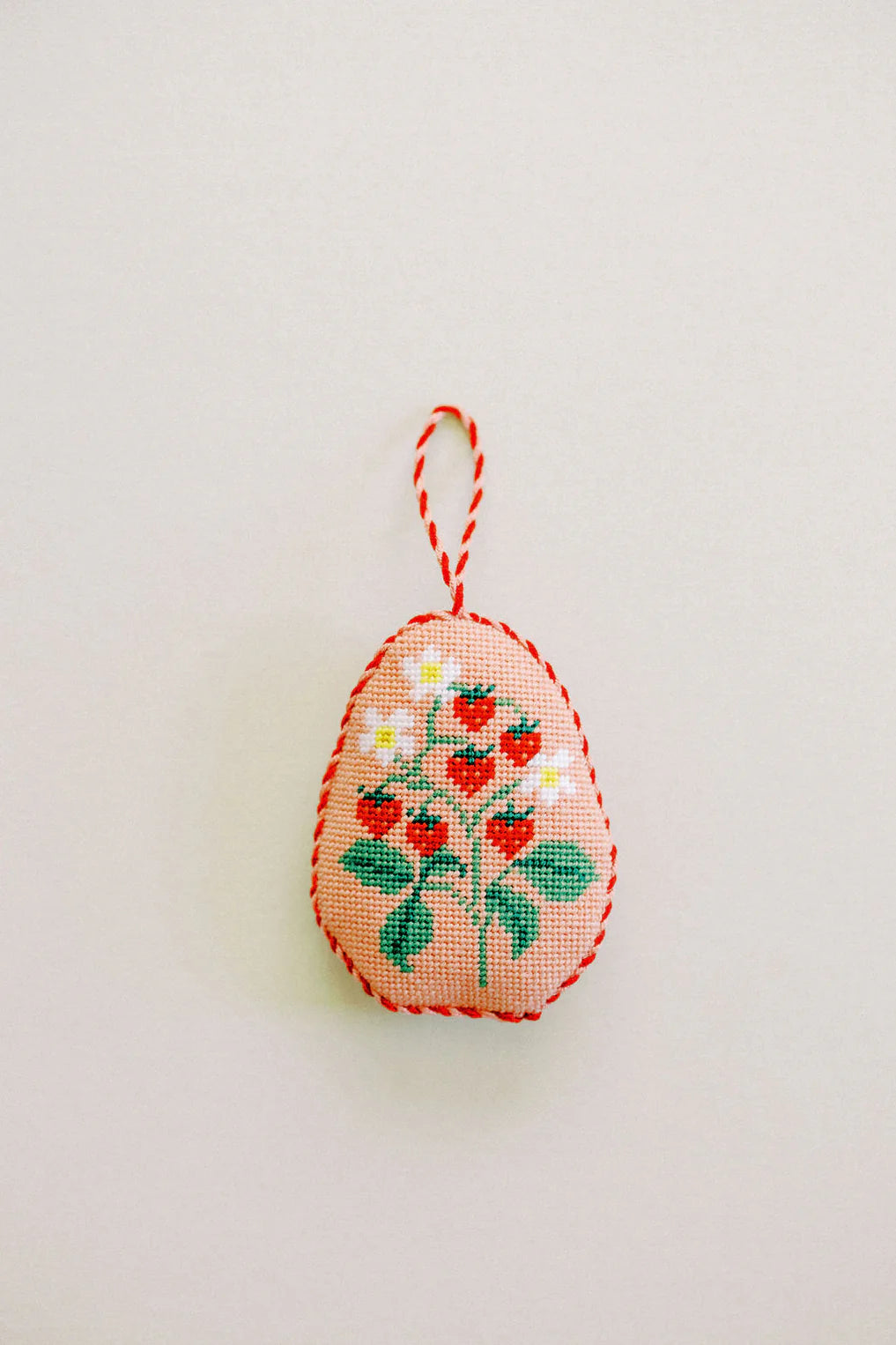 This is a hand painted needlepoint canvas by Le Point Studio. From the Egg series, it features a pink egg with little strawberries. Stitched examples shown for inspiration, materials and finishing services sold separately.