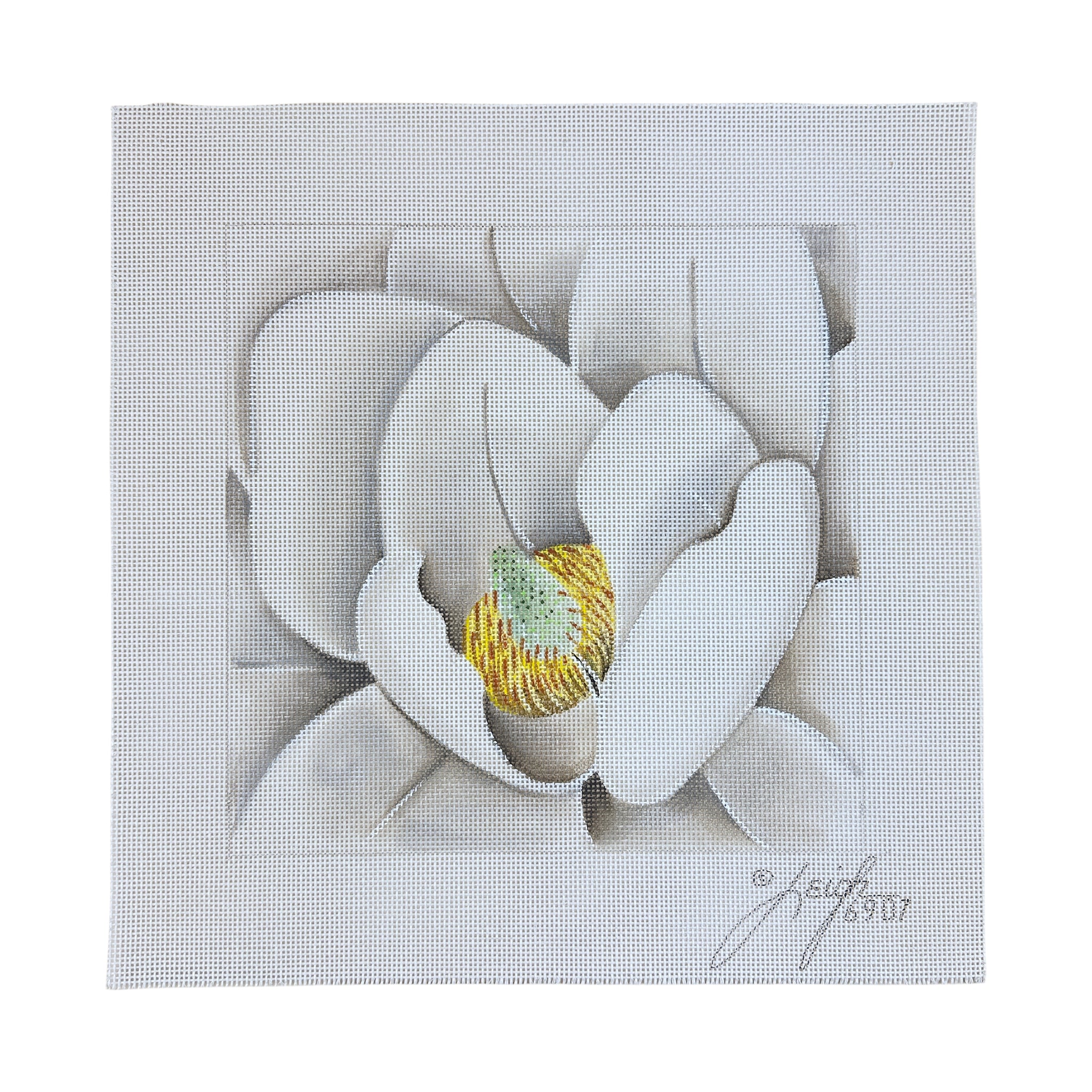 A beautiful hand painted needlepoint canvas from Leigh Designs featuring a white magnolia.