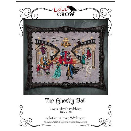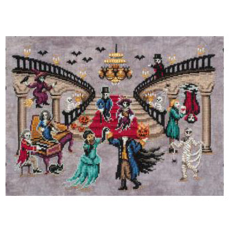 This is a printed cross stitch pattern by Lola Crow. It features vampires, witches, mummies, the headless horseman and, of course, ghosts. Haunting music will be provided by the ghosts of Mozart and Vivaldi. This elegant spooky scene is inspired by the Paris Opera House, complete with a chandelier and the Phantom. It has a small amount of backstitching and the example is stitched with 2 strands of DMC cotton floss on 32 count linen.