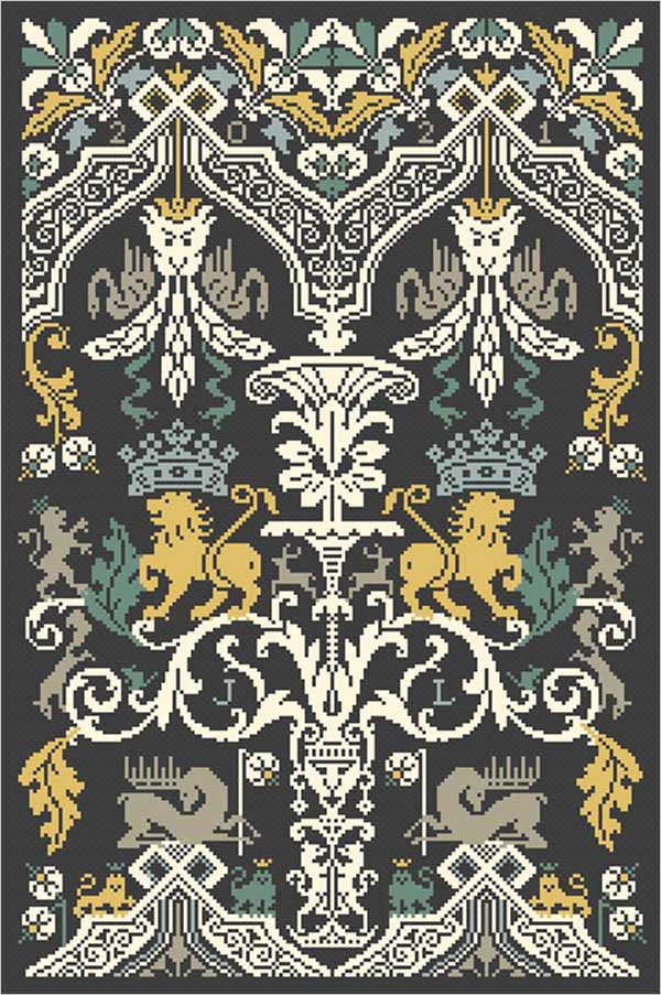 This cross stitch pattern from Long Dog Samplers features a regal design full of lions, swans and other creatures. It uses 5 colors of Gentle Art Sampler floss.