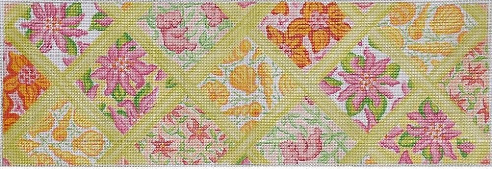 A beautiful hand painted needlepoint design from Kate Dickerson Needlepoint Collections. Lilly-inspired. Yellow, Pinks, Corals & Greens.