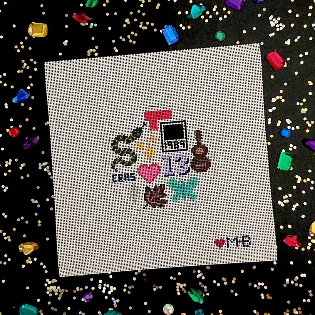 This hand painted needlepoint canvas by Love MHB Studio features symbols representing Taylor Swifts albums.