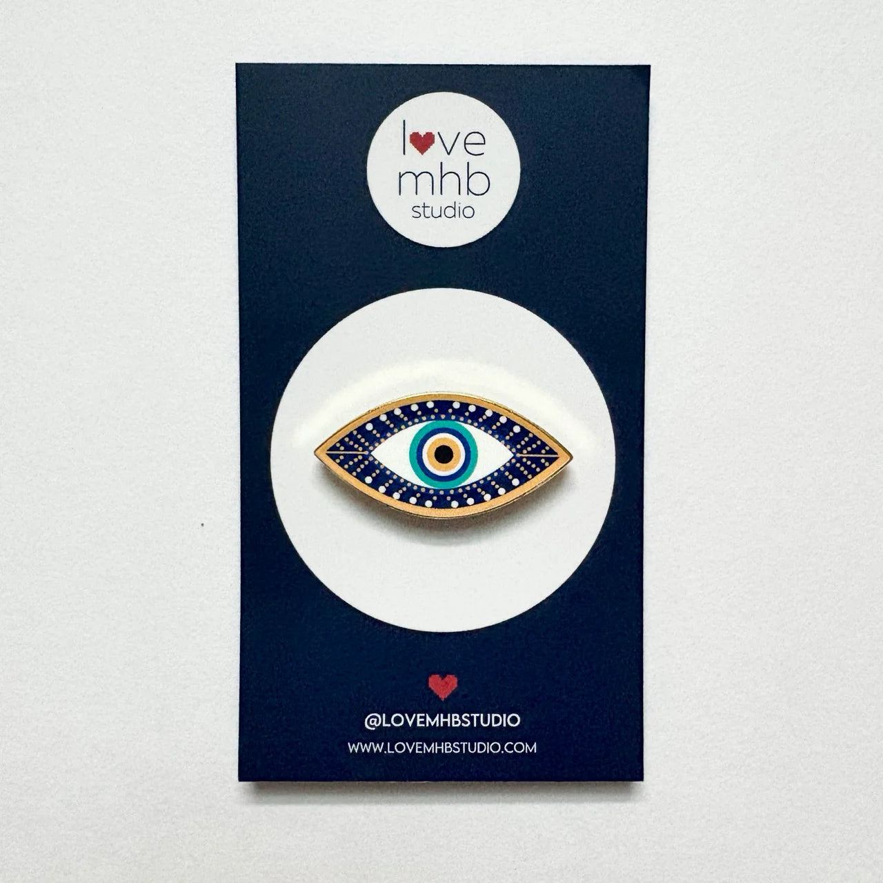 This is a needle minder from Love MHB Studio. It's an enamel needle minder with a very strong magnet on the back featuring a blue and gold evil eye.