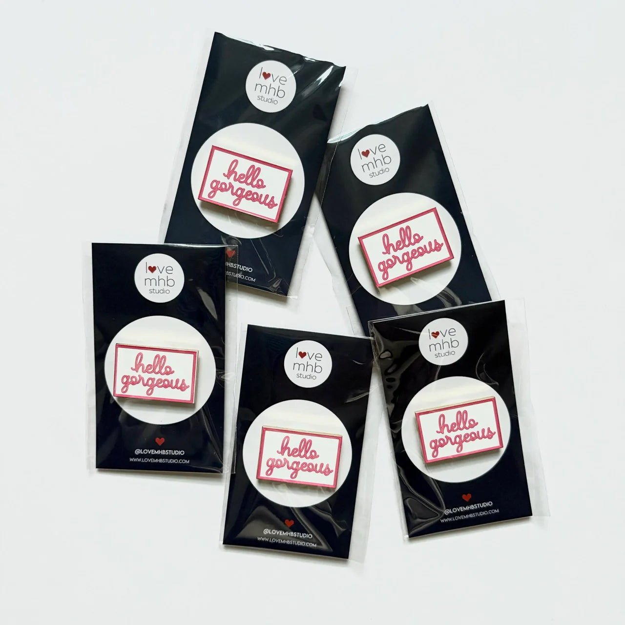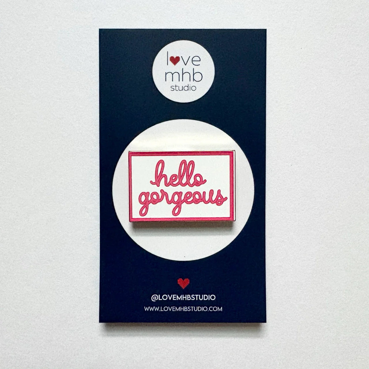 This is a needle minder from Love MHB Studio. It's an enamel needle minder with a very strong magnet on the back featuring a sign that says "Hello Gorgeous".