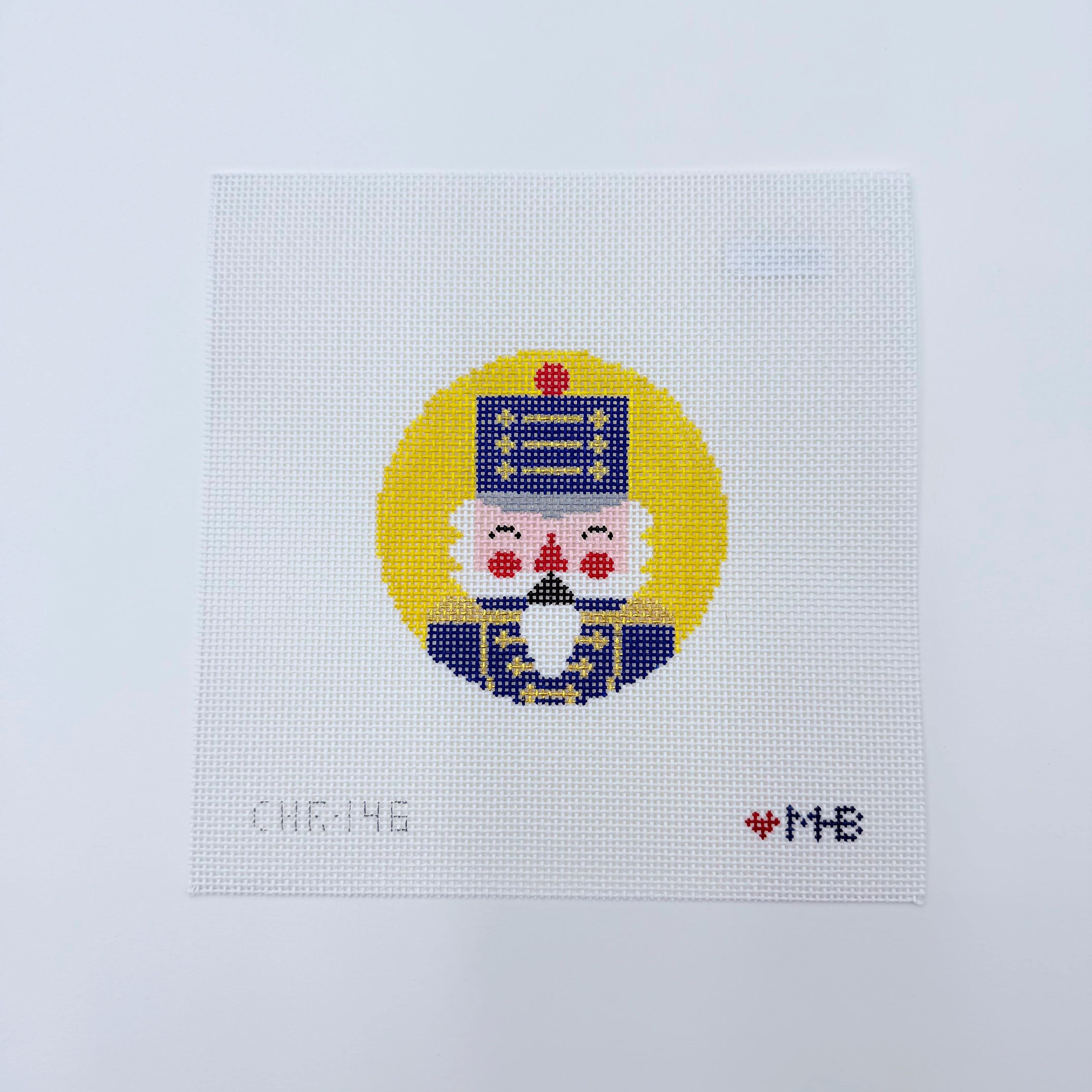 This is a hand painted needlepoint canvas from Love MHB Studio. It features a blue nutcracker on a yellow background.