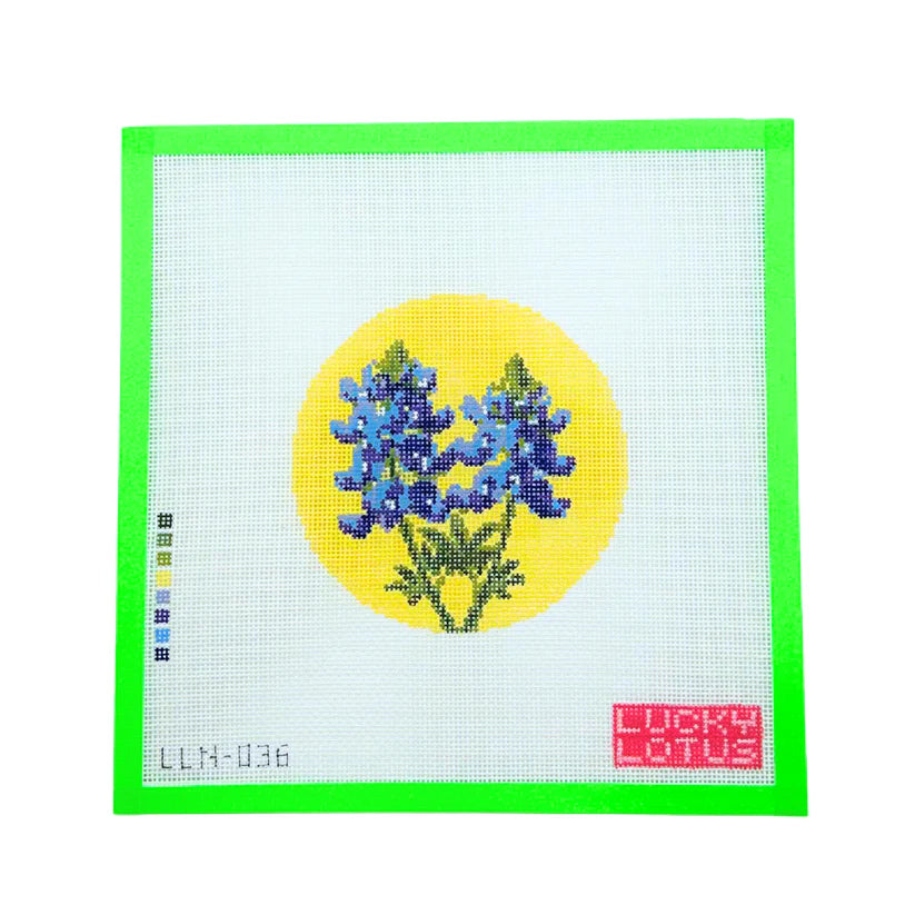 This is a hand painted needlepoint canvas by Lucky Lotus. It features bluebonnets, for Texas, against a bright yellow background, as part of the Flowers of the 50 States Series.