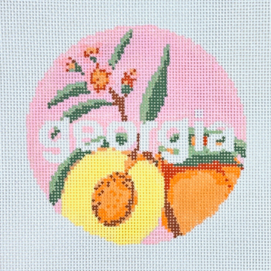 This hand painted needlepoint canvas by Lucky Lotus Needlepoint features luscious Georgia peaches.