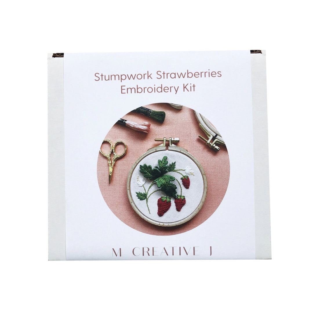 In this hand embroidery kit from M Creative J you’ll learn how to make sculptural strawberries and leaves that stick out from the fabric. You’ll learn how to stitch the stem stitch, pistil stitch, detached chain stitch, berry stitch, couching, long and short satin stitch, button hole stitch, and corded detached buttonhole stitch.