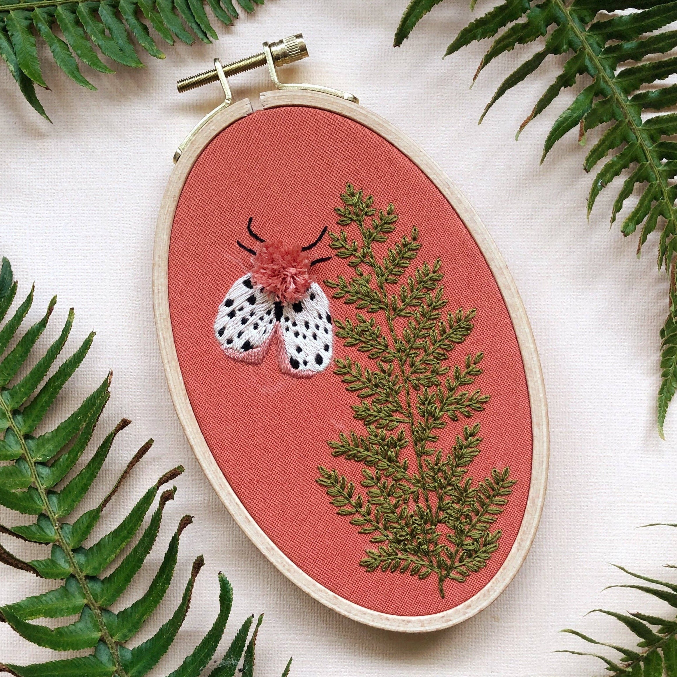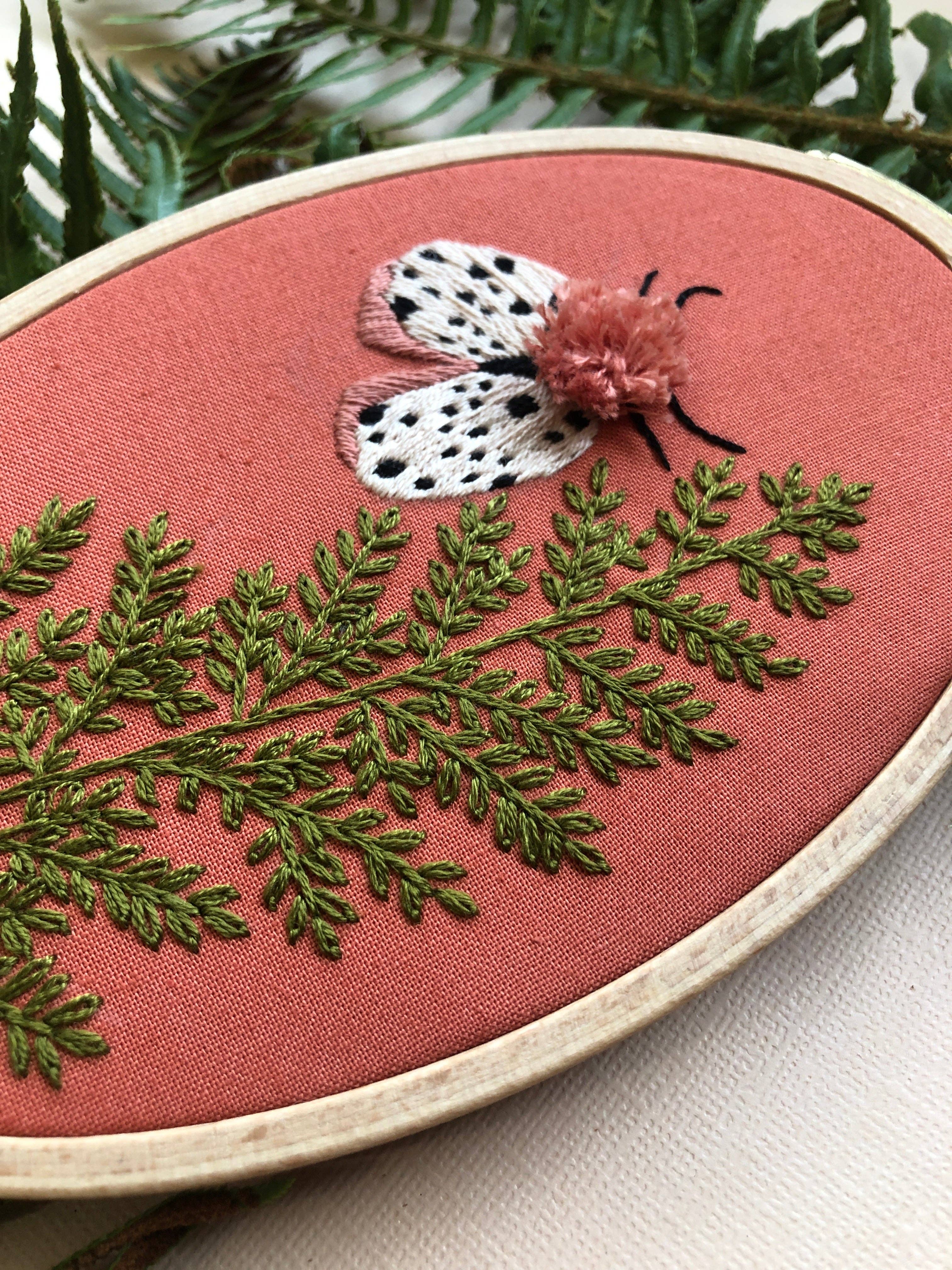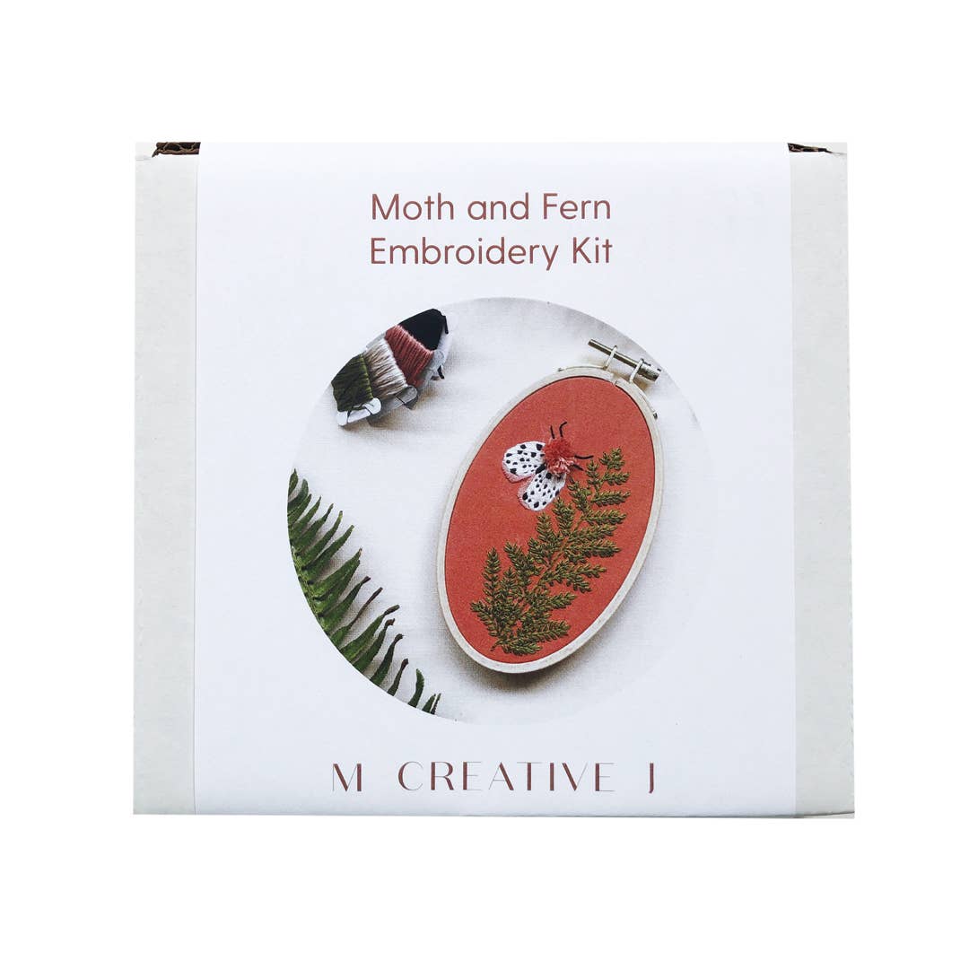 This is an embroidery kit from M Creative J. It features a cute design with a fern and a bug. Inspired by late night walks, the Moth and Fern embroidery kit has everything you need to complete this nature inspired design.