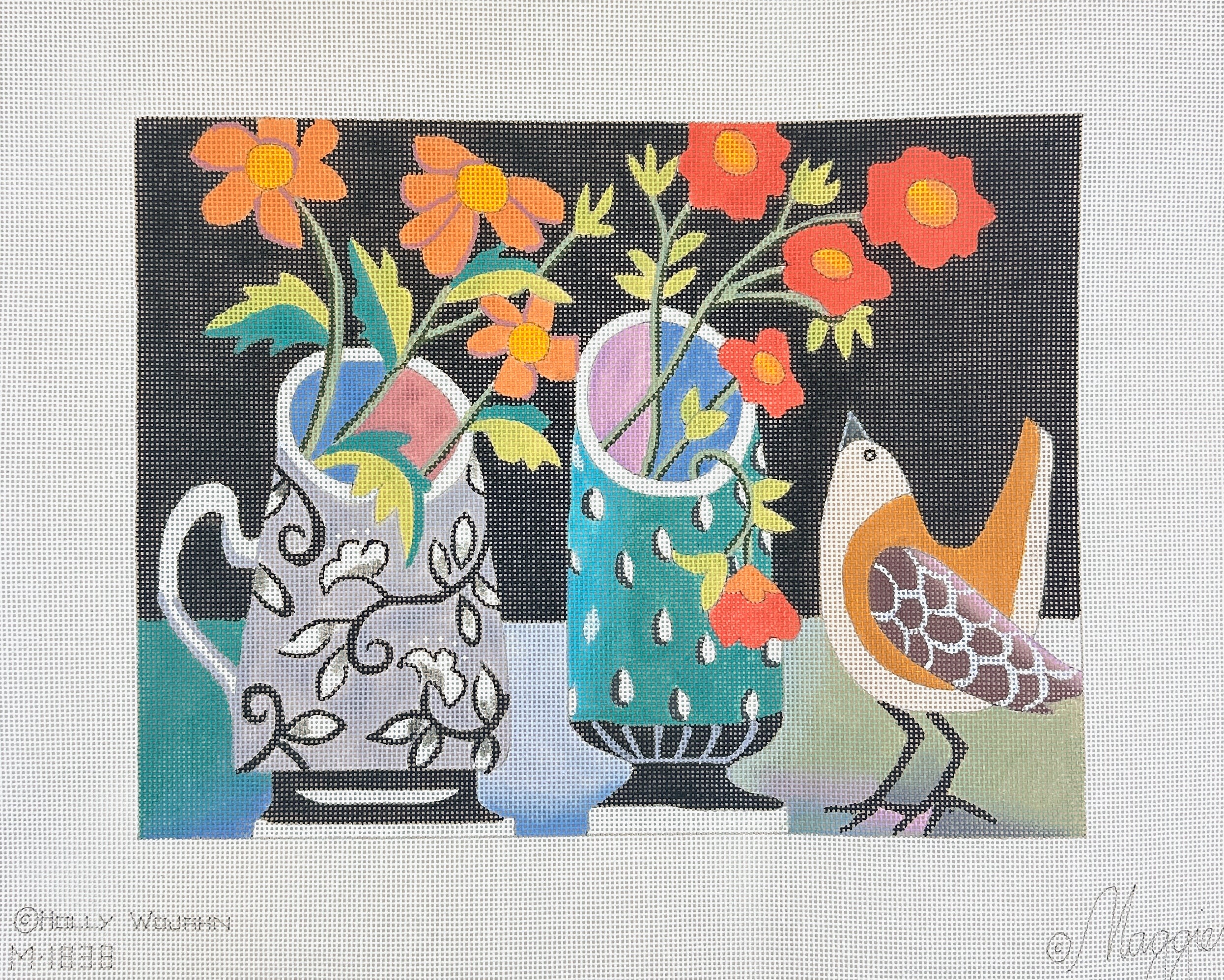 This is a hand painted needlepoint canvas by Holly Wojahn from Maggie Co featuring vases of flowers with a pretty bird.