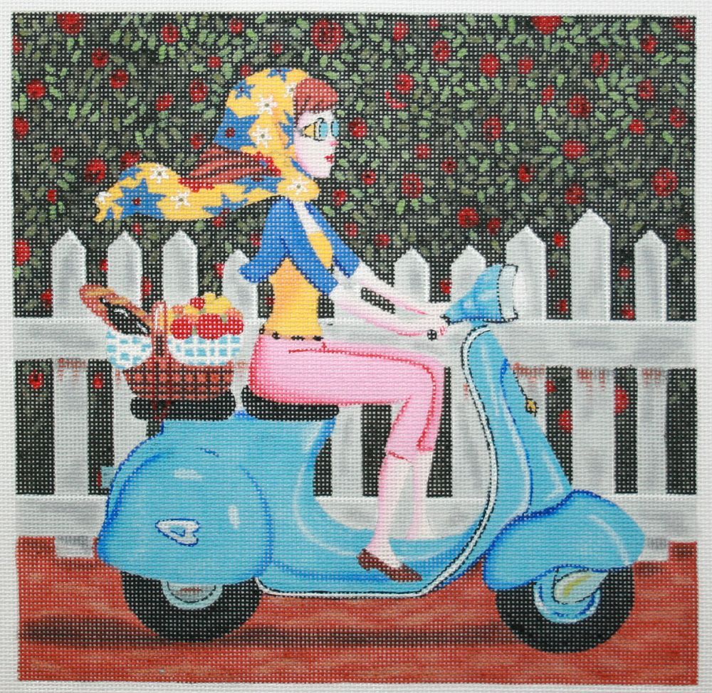 A beautiful hand painted needlepoint design from Maggie Co featuring a woman on a vespa scooter with a basket of fruit.