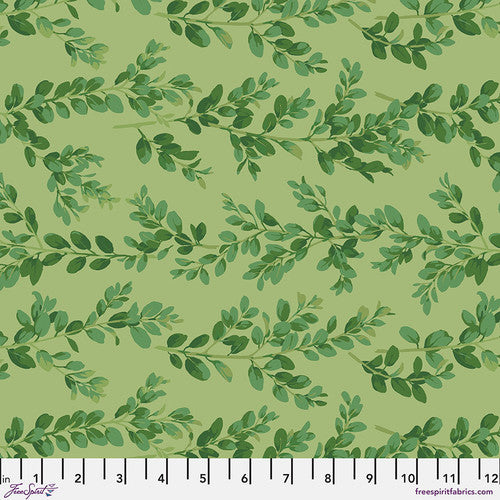 This cotton fabric from Martha Negley features an elegant monochromatic green boxwood branch pattern.
