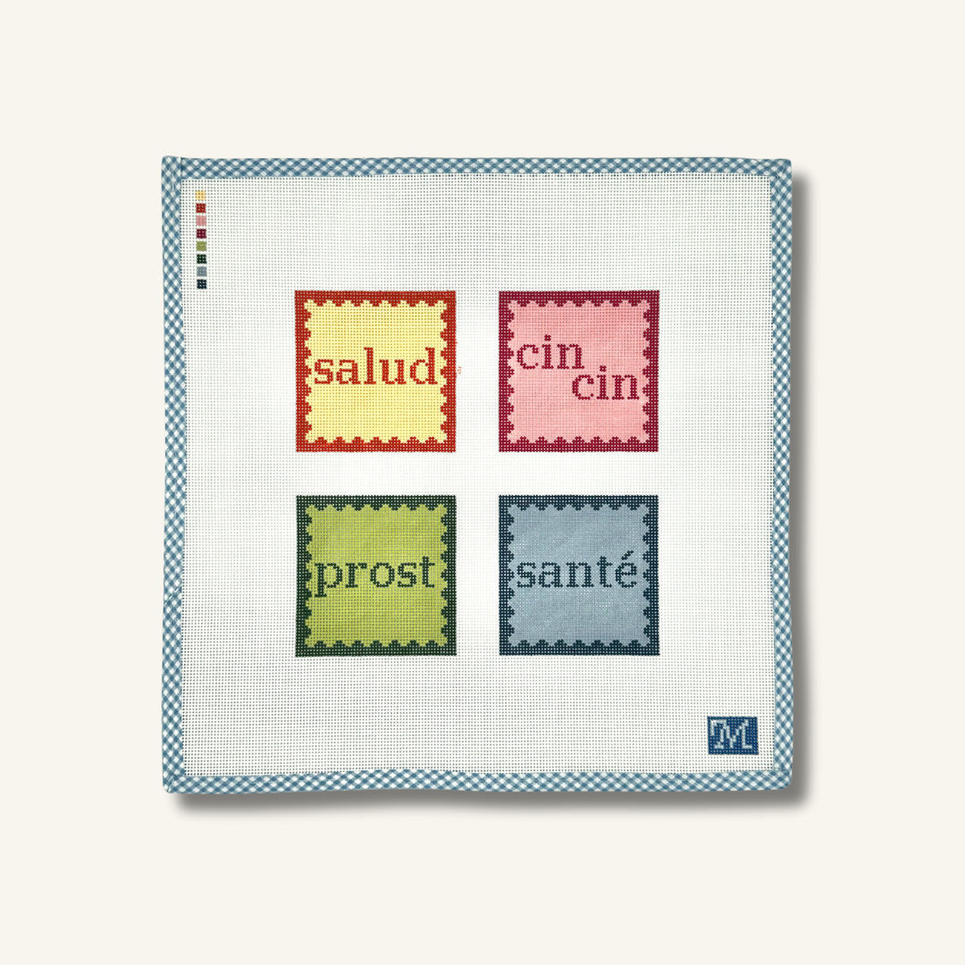 This hand painted needlepoint canvas by Maura Nolan Designs features a set of coasters each a different colors with "cheers" in different languages.