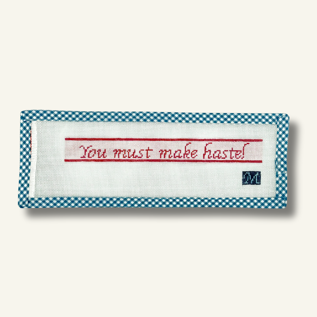 This hand painted needlepoint canvas by Maura Nolan Designs features the phrase "You must make haste" in red and pink.