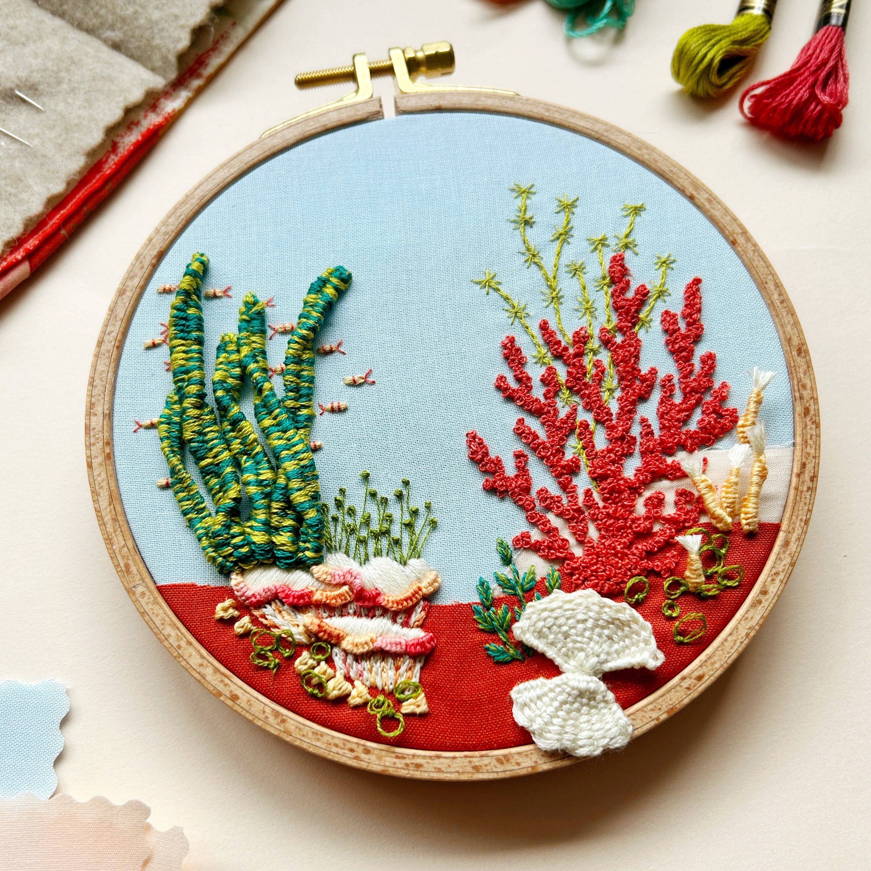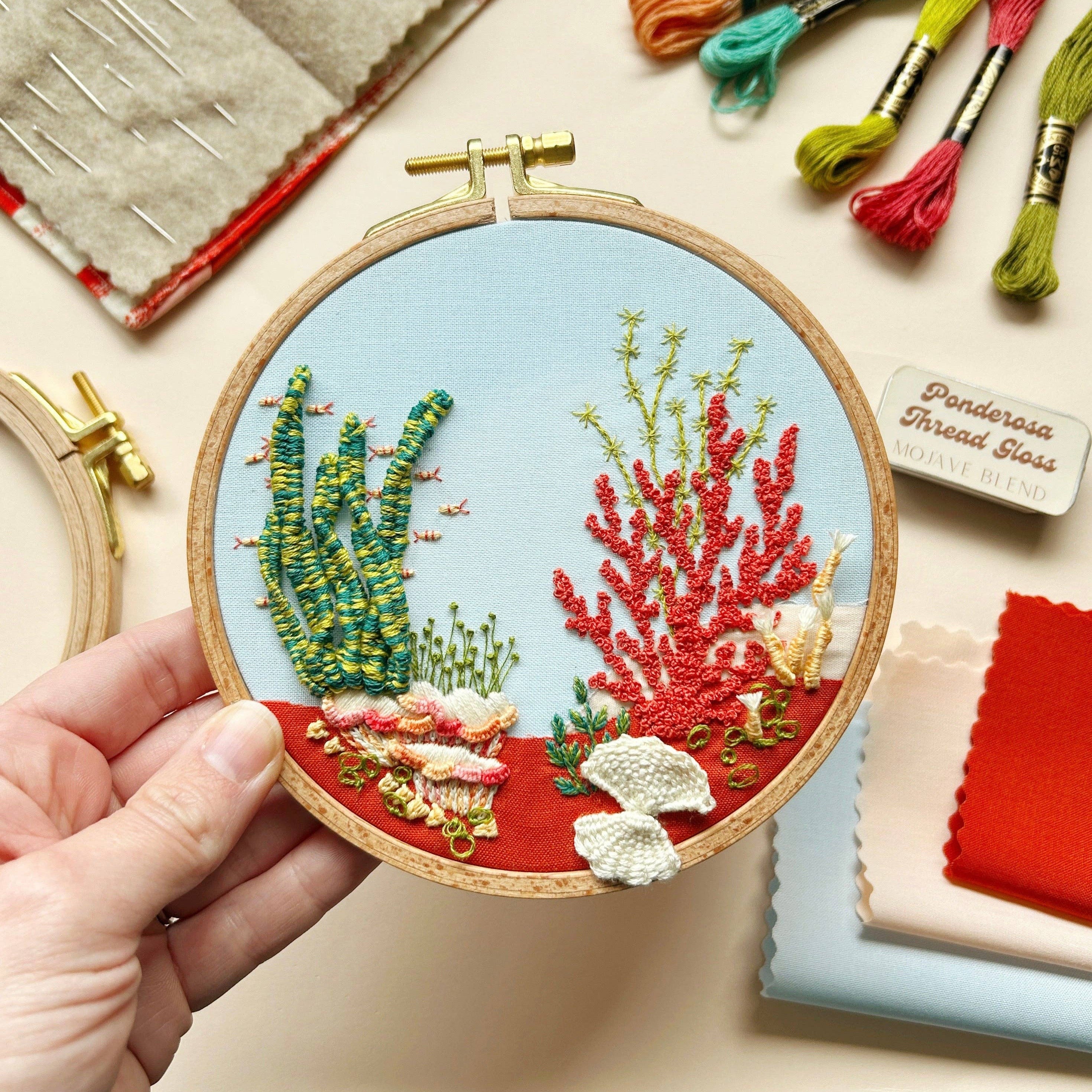 Create a three-dimensional under the sea scene with M Creative J's embroidery kit. Full of lush plant life, coral, and tiny fishes, this hand embroidery kit features a fabric applique ground surrounded by textural coral, plants, and more.
