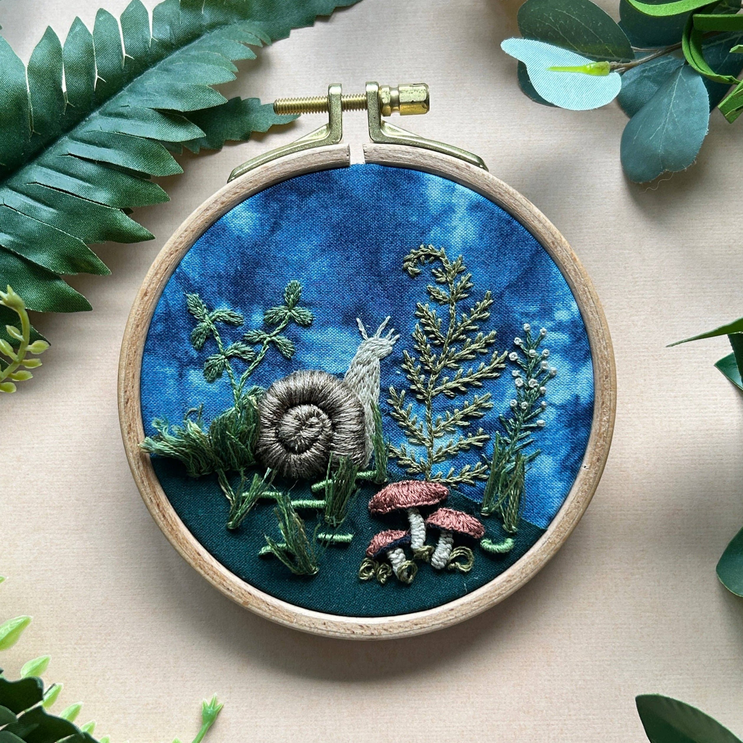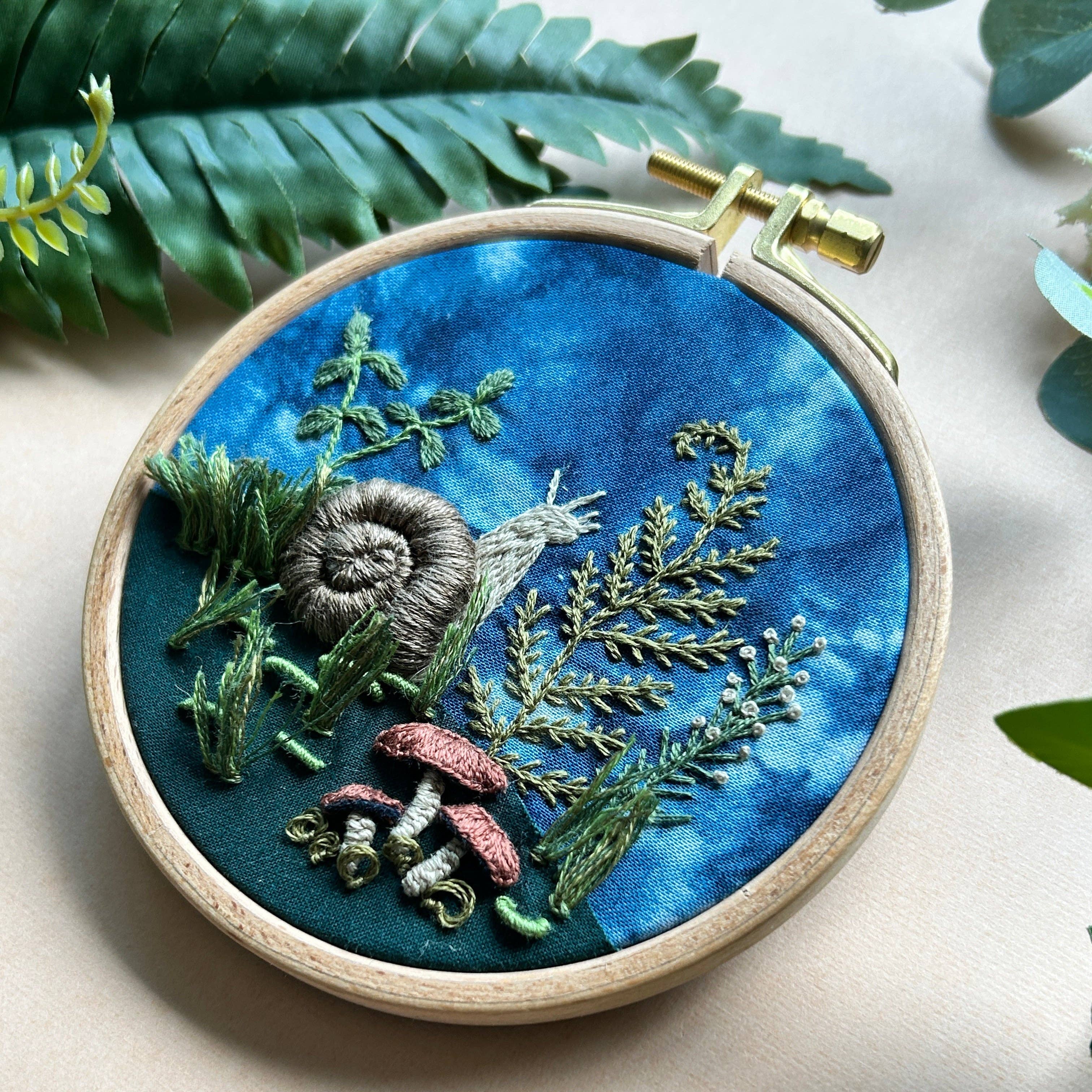 Create a three-dimensional snail among plants with M Creative J's embroidery kit. Full of lush plant life, this DIY hand embroidery kit features a fabric applique ground surrounded by textural plants, 3D mushrooms, and more.