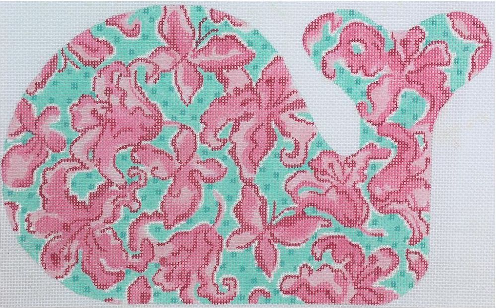 A beautiful hand painted needlepoint design from Kate Dickerson Needlepoint Collections. Lilly Lilies & Butterflies - Pinks on Turquoise.