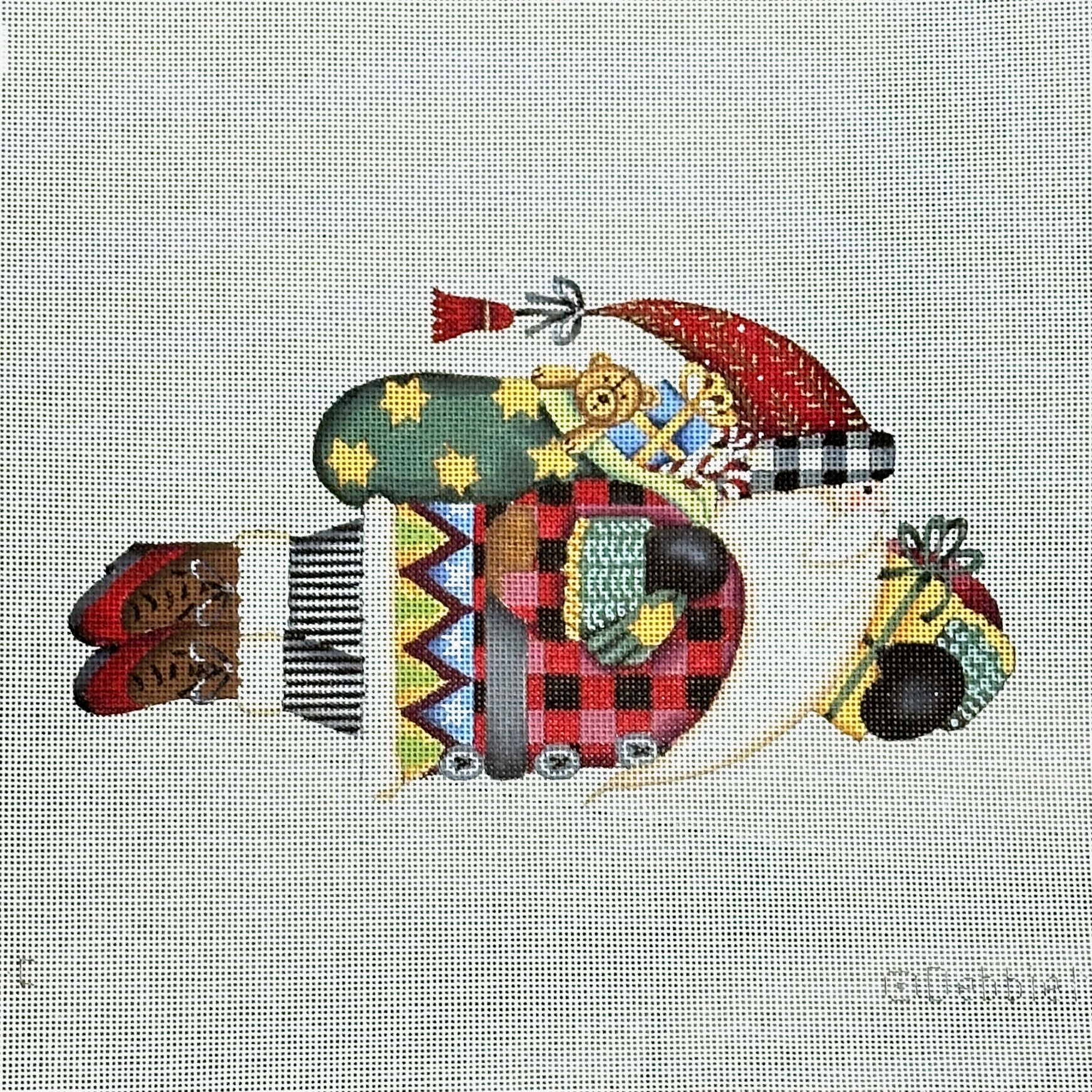 This hand painted needlepoint canvas by Debbie Mumm for Melissa Shirley Designs features a flying Santa loaded with gifts.