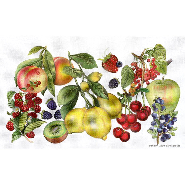 This is a hand painted needlepoint canvas by Mary Lake-Thompson for Melissa Shirley Designs. It features an arrangement of richly colored fruits and berries.