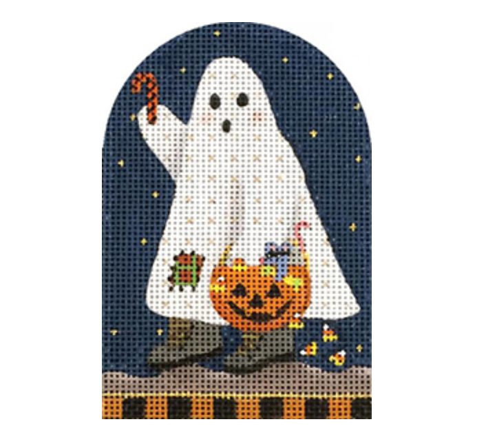 This hand painted Halloween needlepoint canvas by Melissa Shirley Designs features a kid dressed in a ghost costume.