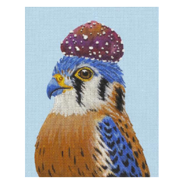 This is a hand painted needlepoint canvas by Melissa Shirley Designs. It features Jake, the American Kestrel, with a sweet purple mushroom on his head.