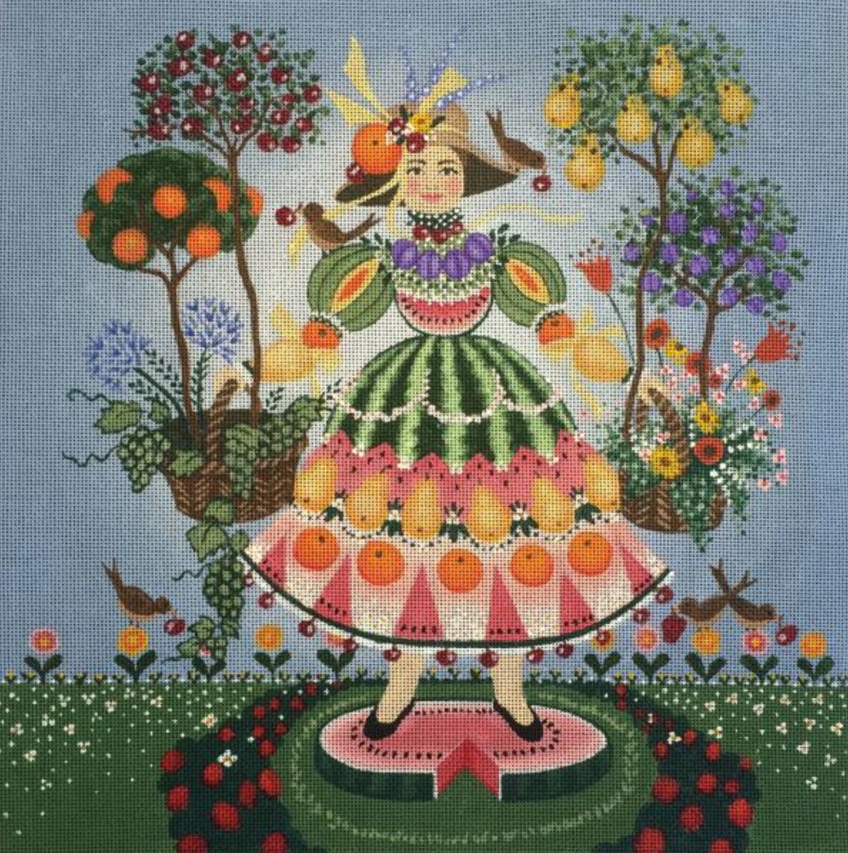 This hand painted needlepoint canvas by John Johanssen for Melissa Shirley Designs features a girl decked out in watermelon and fruit finery.