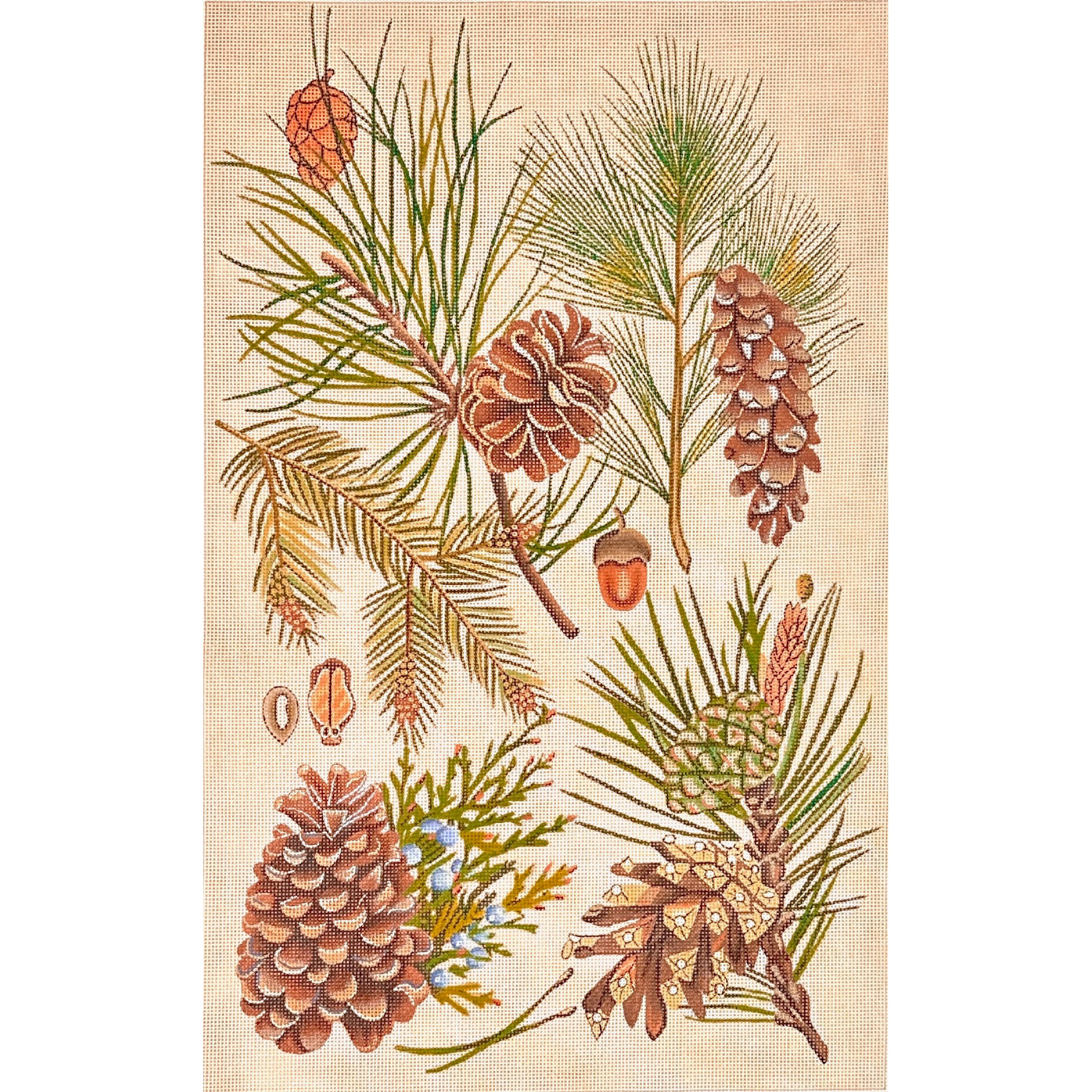 A beautiful hand painted needlepoint canvas designed by Mary Lake Thompson from Melissa Shirley Designs featuring different species of pine foliage and pine cones.
