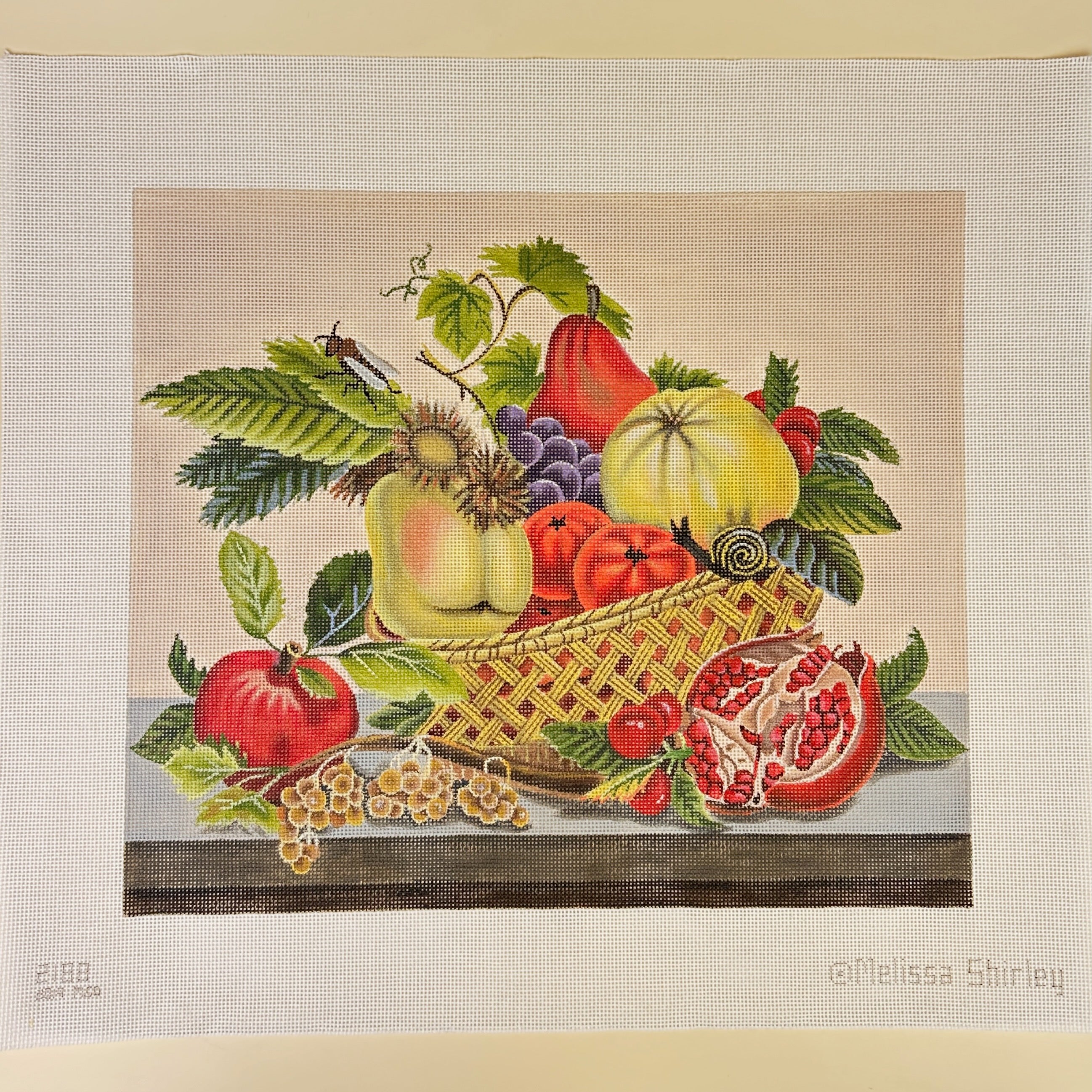 This hand painted needlepoint canvas by Melissa Shirley Designs features a beautiful still live with a basket overflowing with pears pomegranates and other fruit.