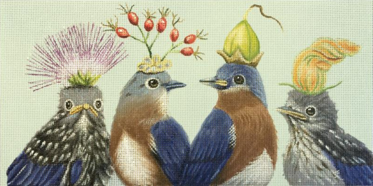 This hand painted needlepoint canvas by Vicki Sawyer for Melissa Shirley Designs features a family of blue birds wearing berries, fruit, and blossoms on their heads.