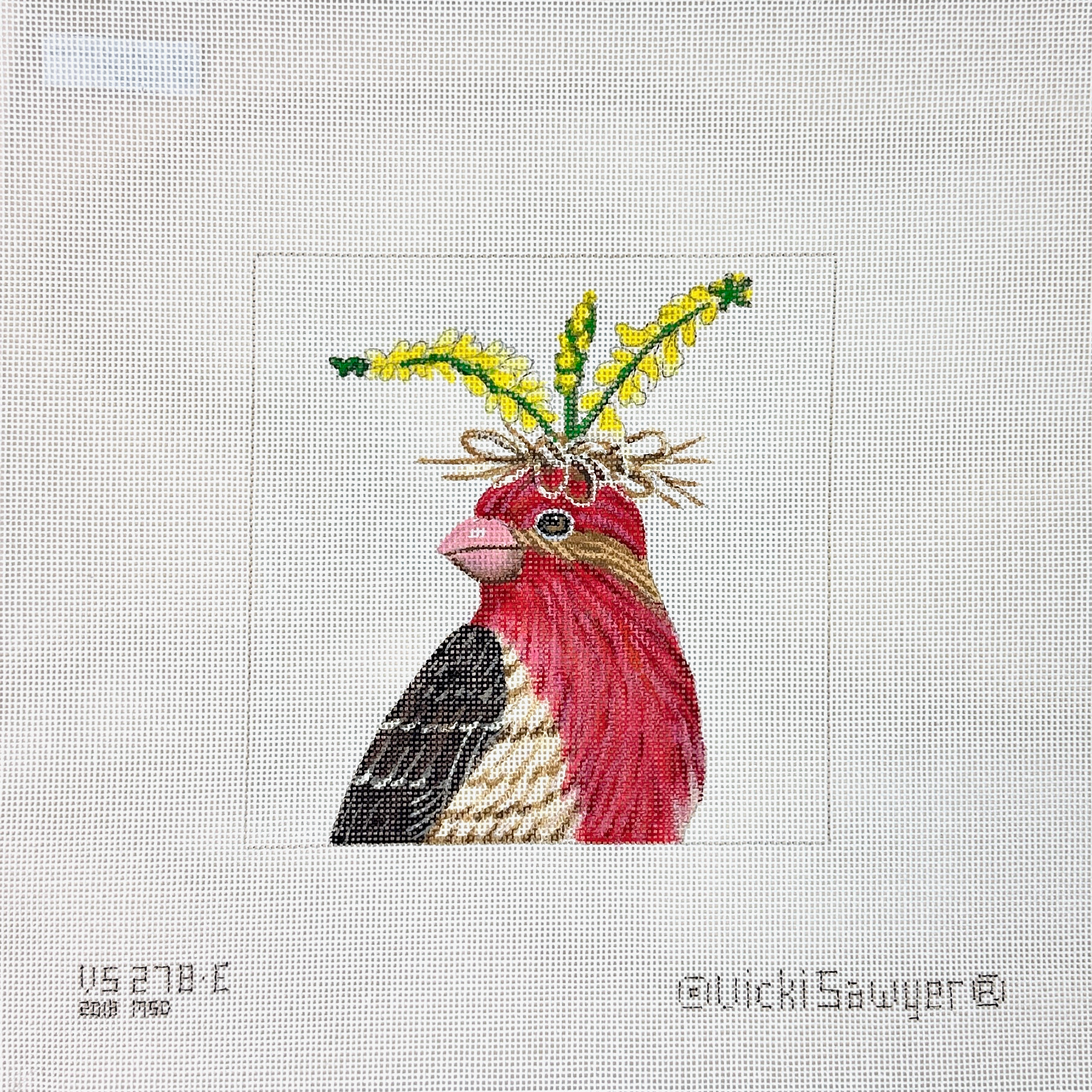 This hand painted needlepoint canvas by Vicki Sawyer for Melissa Shirley Designs features a colorful house finch named Rudy wearing a spring of yellow flowers.