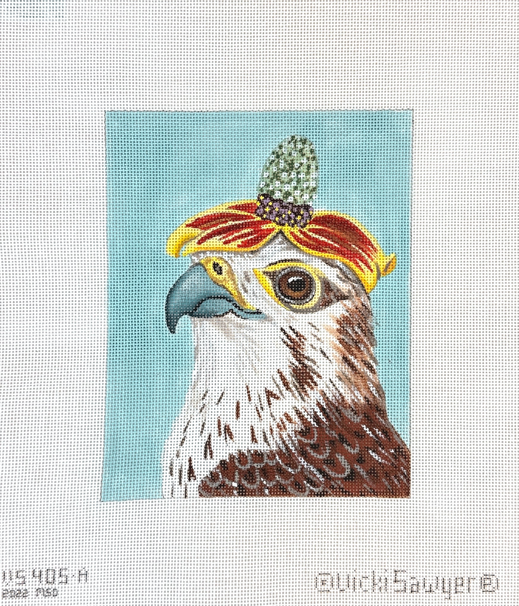 This is a hand painted needlepoint canvas by Vicki Sawyer from Melissa Shirley Designs. It features a falcon wearing a cowboy hat shaped succulent on it's head.