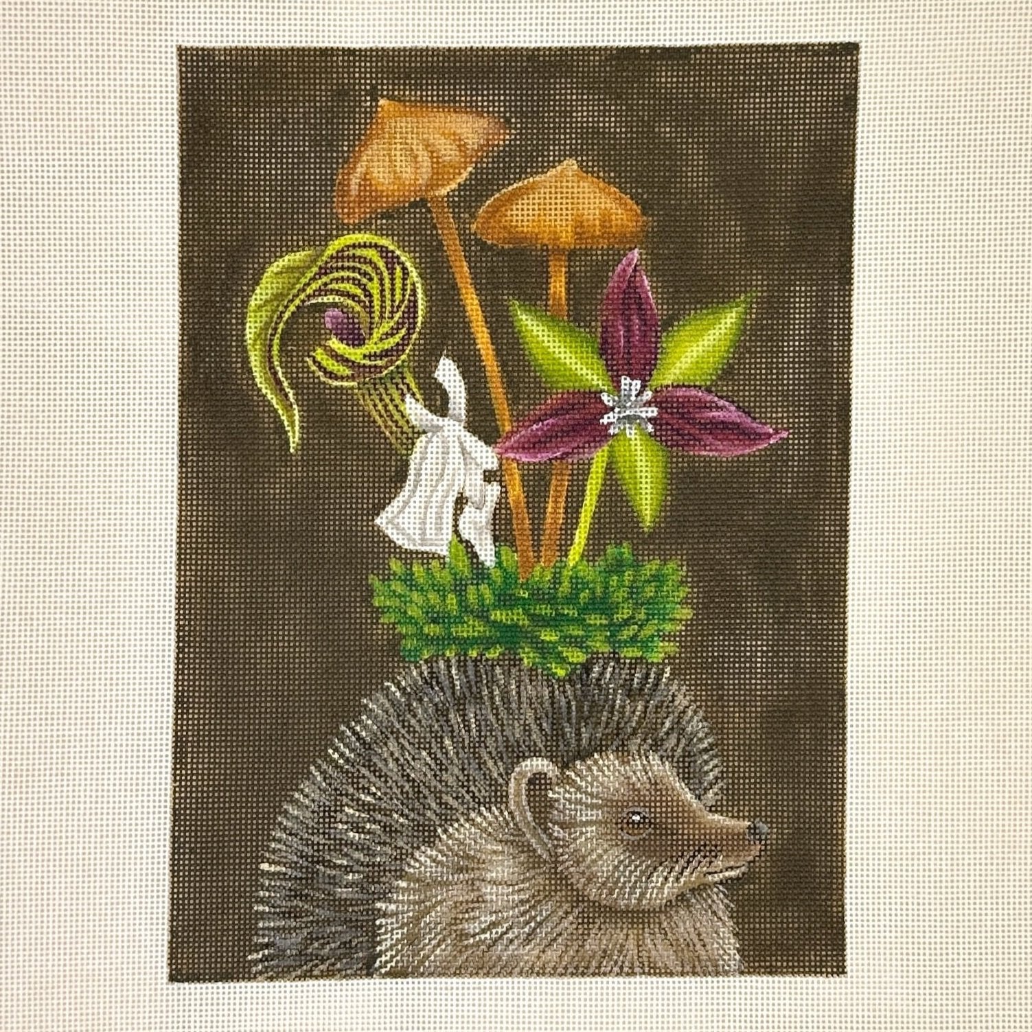 This hand painted needlepoint canvas by Vicki Sawyer for Melissa Shirley Designs features a hedgehog with a cap of flowers and mushrooms.