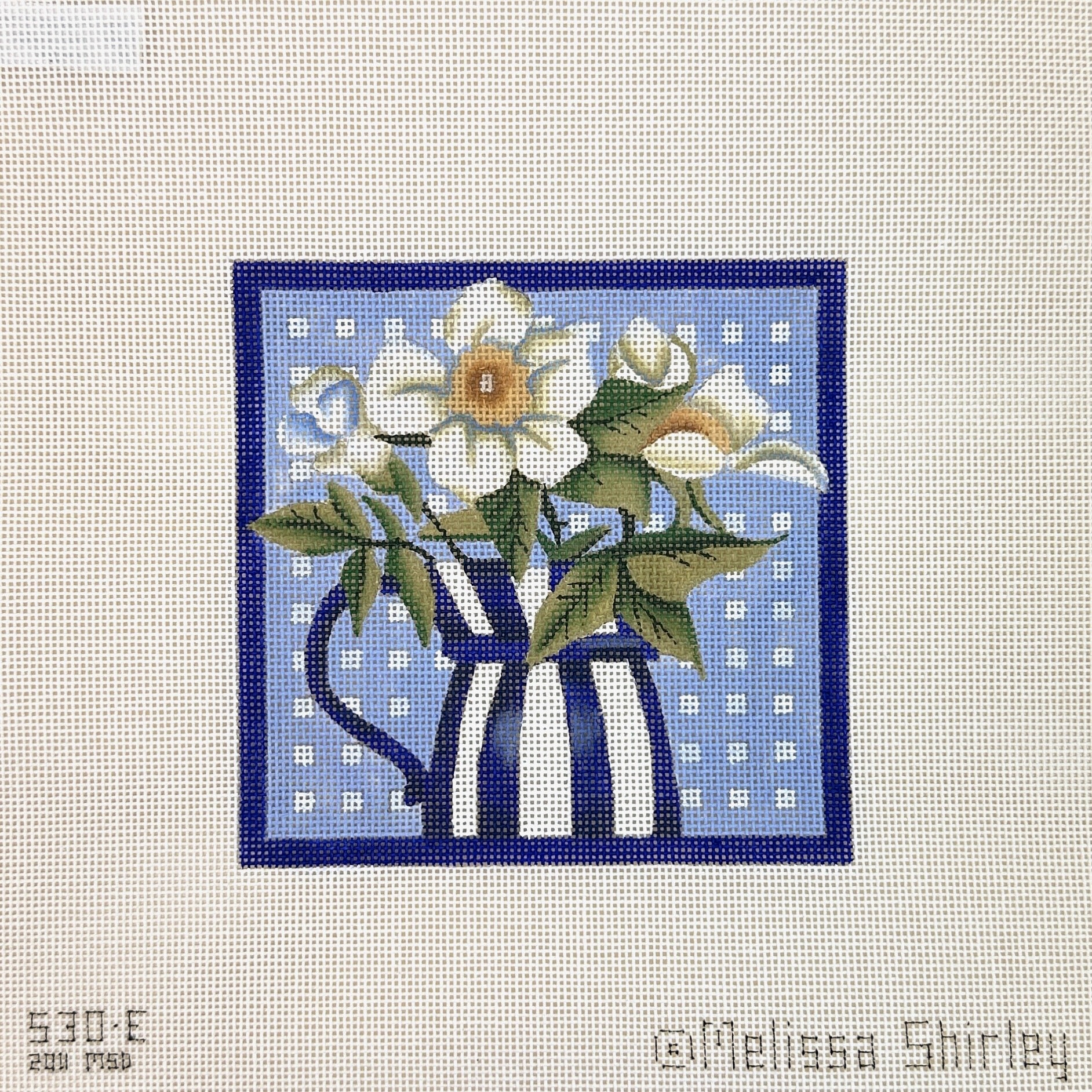 This is a needlepoint canvas from Melissa Shirley Designs. It features a blue vase filled with several white roses.