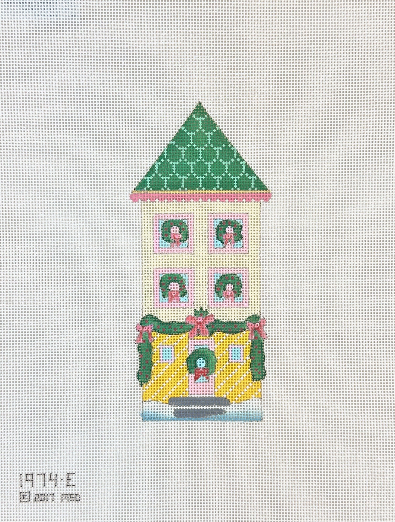 This is a hand painted needlepoint canvas from Melissa Shirley Designs. It features a cute yellow house decorated for the holidays.