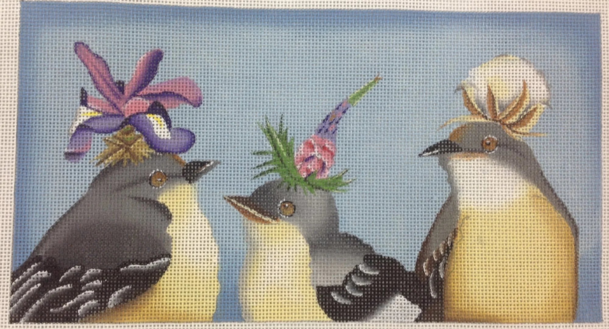 This is a stitch guide written by Carolyn Hedge Baird for "Baby Mockingbirds" by Vicki Sawyer from Melissa Shirley Designs. The design features a painting of several mockingbirds with plant hats. This guide will walk you through the entire stitching process for the canvas.