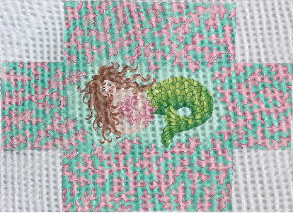 Kate Dickerson Needlepoint Collections Mermaid with Pink Coral On Turquoise Needlepoint Canvas