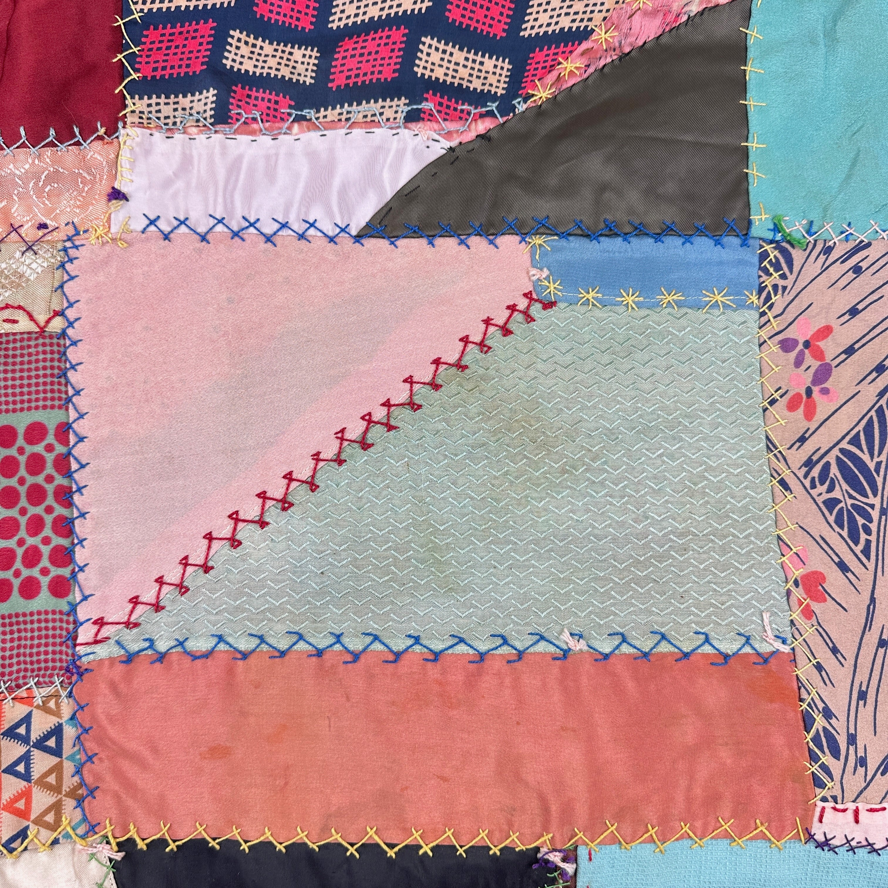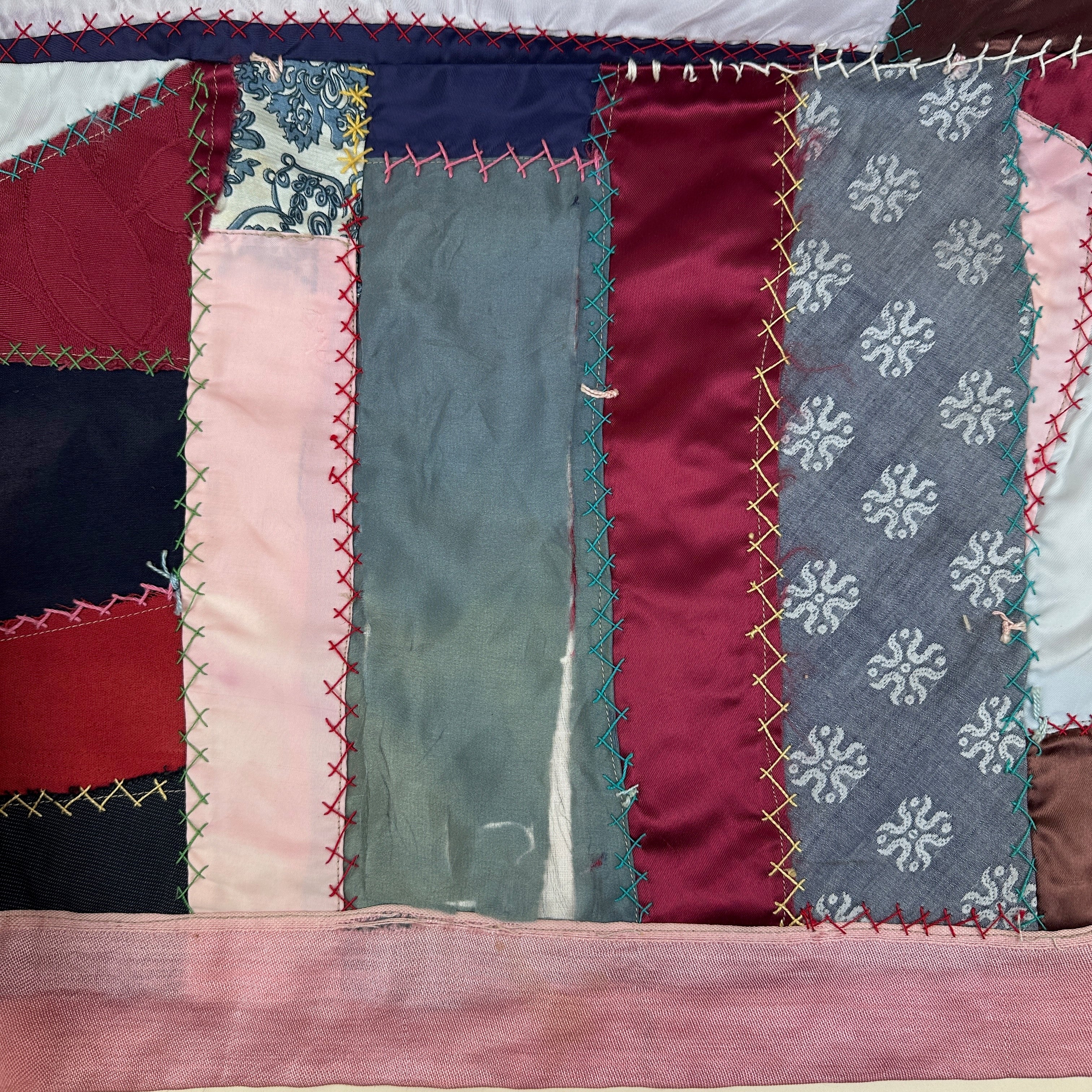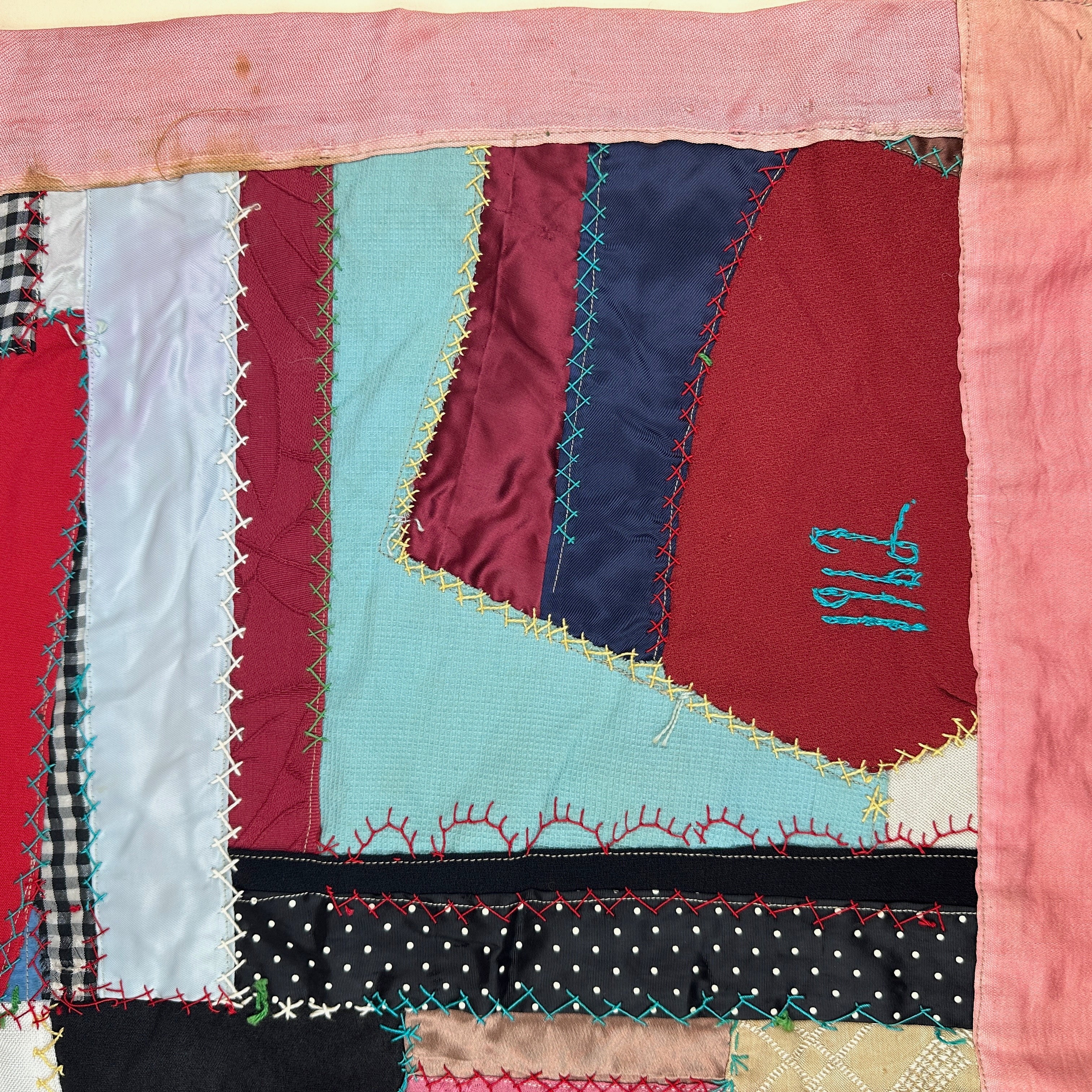 This crazy quilt has two dates on it: 1950 and 1962 - perhaps the start and finish dates. It features a wide variety of fabrics from the 1940s-60s including satin, silk, wool, rayon, polyester, and cotton. It is backed in a pink rayon fabric. It was machine sewn with hand embroidered details. It has a couple shattered patches, one patch with a few small holes in the top only, one patch that had shattered and was repaired with embroidery, a few small spots, and some fading on the back. It is a lightweight quilt - some areas have an inner layer of cotton muslin, but many patches have no inner lining. This quilt has not be washed.