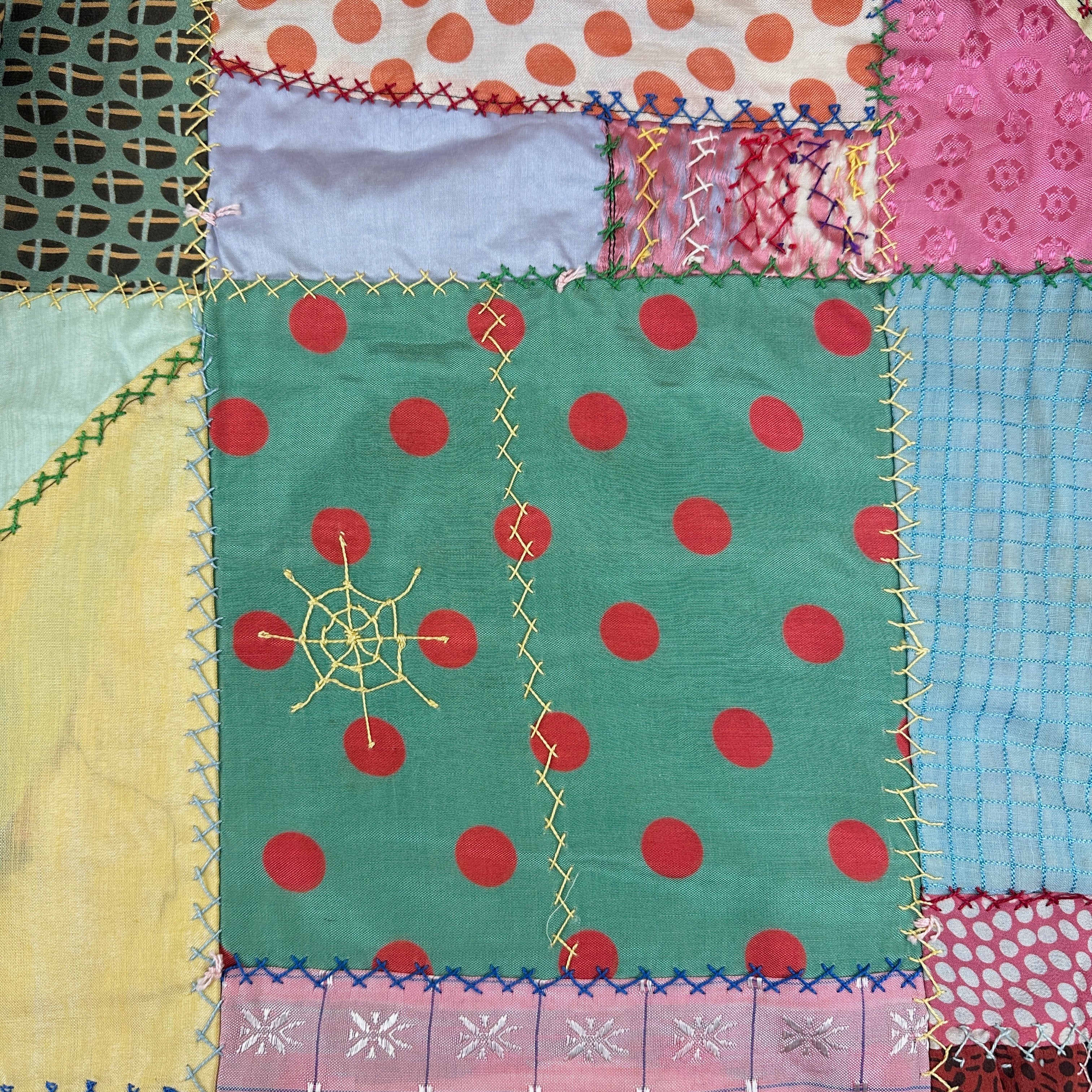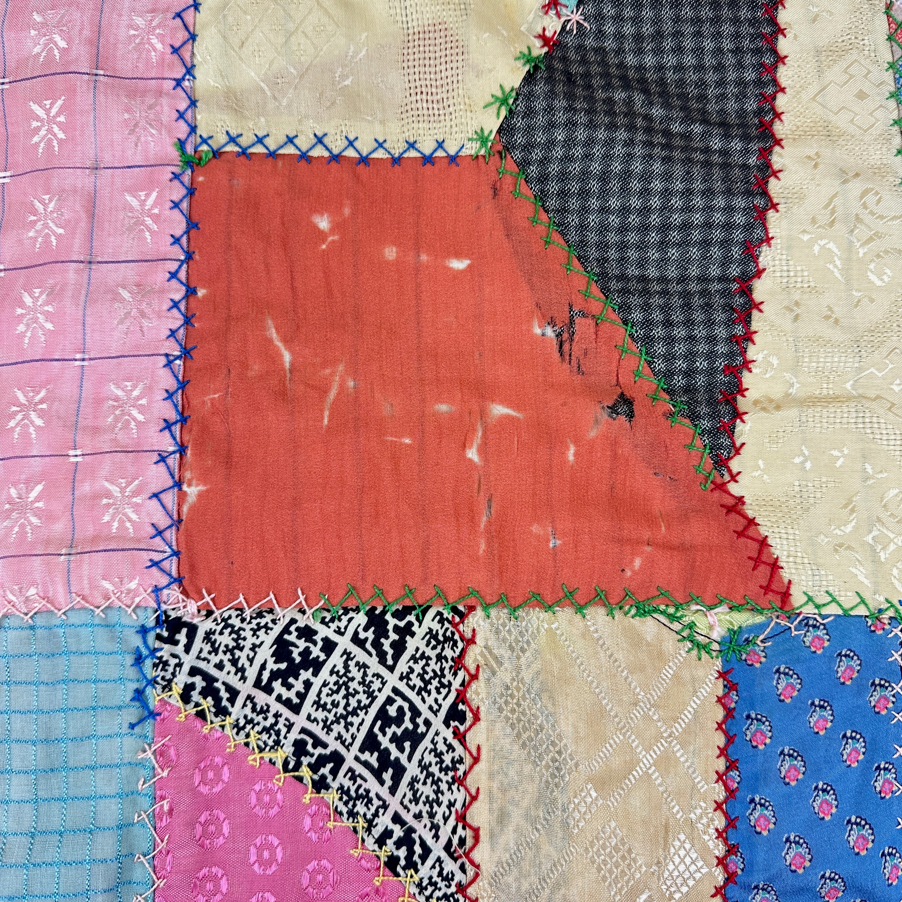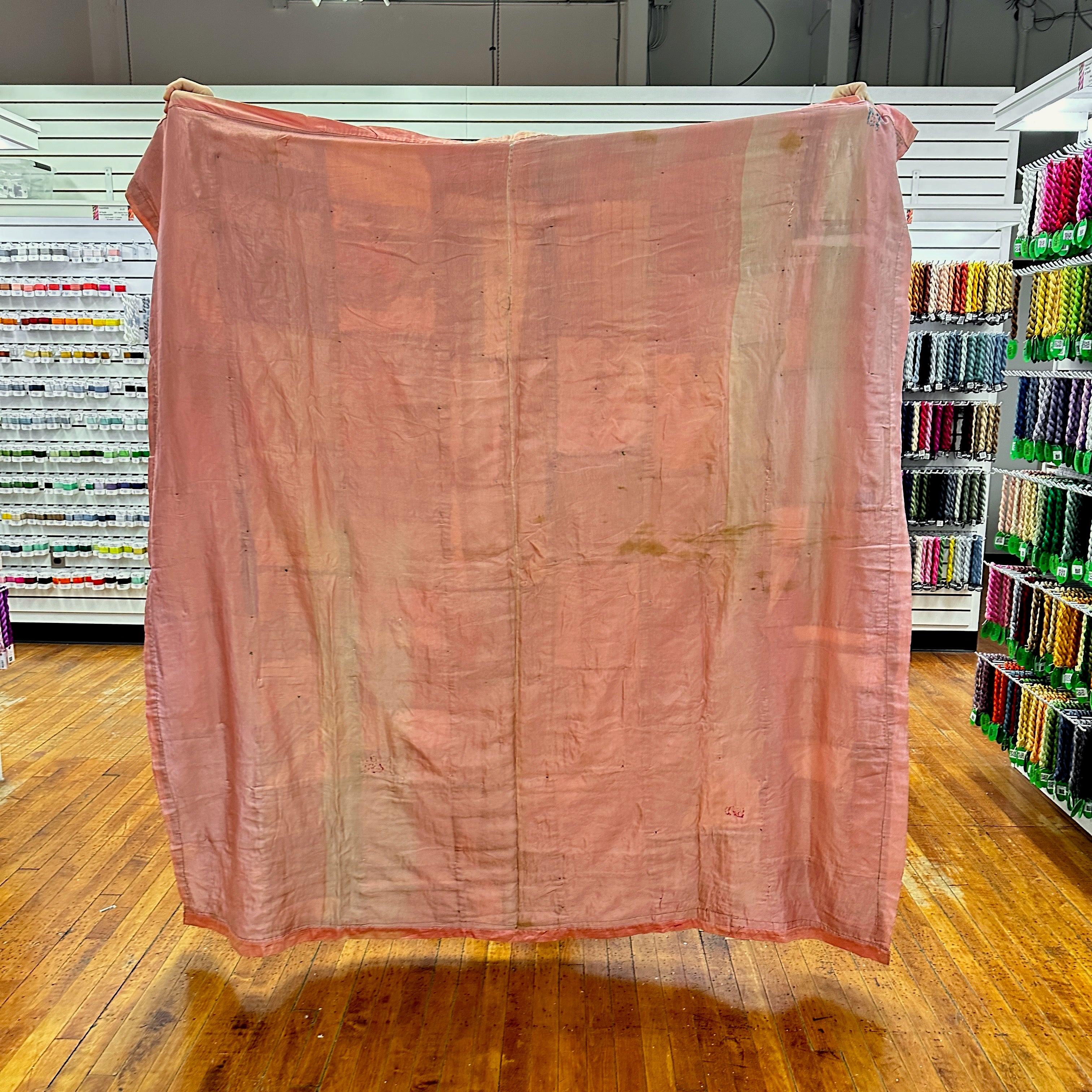 This crazy quilt has two dates on it: 1950 and 1962 - perhaps the start and finish dates. It features a wide variety of fabrics from the 1940s-60s including satin, silk, wool, rayon, polyester, and cotton. It is backed in a pink rayon fabric. It was machine sewn with hand embroidered details. It has a couple shattered patches, one patch with a few small holes in the top only, one patch that had shattered and was repaired with embroidery, a few small spots, and some fading on the back. It is a lightweight quilt - some areas have an inner layer of cotton muslin, but many patches have no inner lining. This quilt has not be washed.