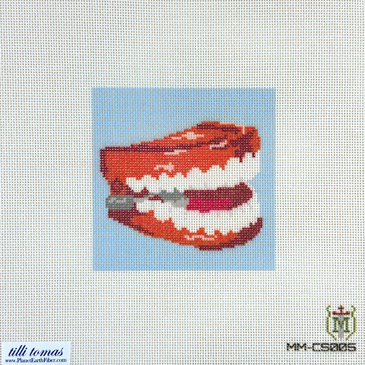 This is a printed needlepoint canvas by Misty Morrow for Tilli Tomas. It features wind-up teeth against a blue background.
