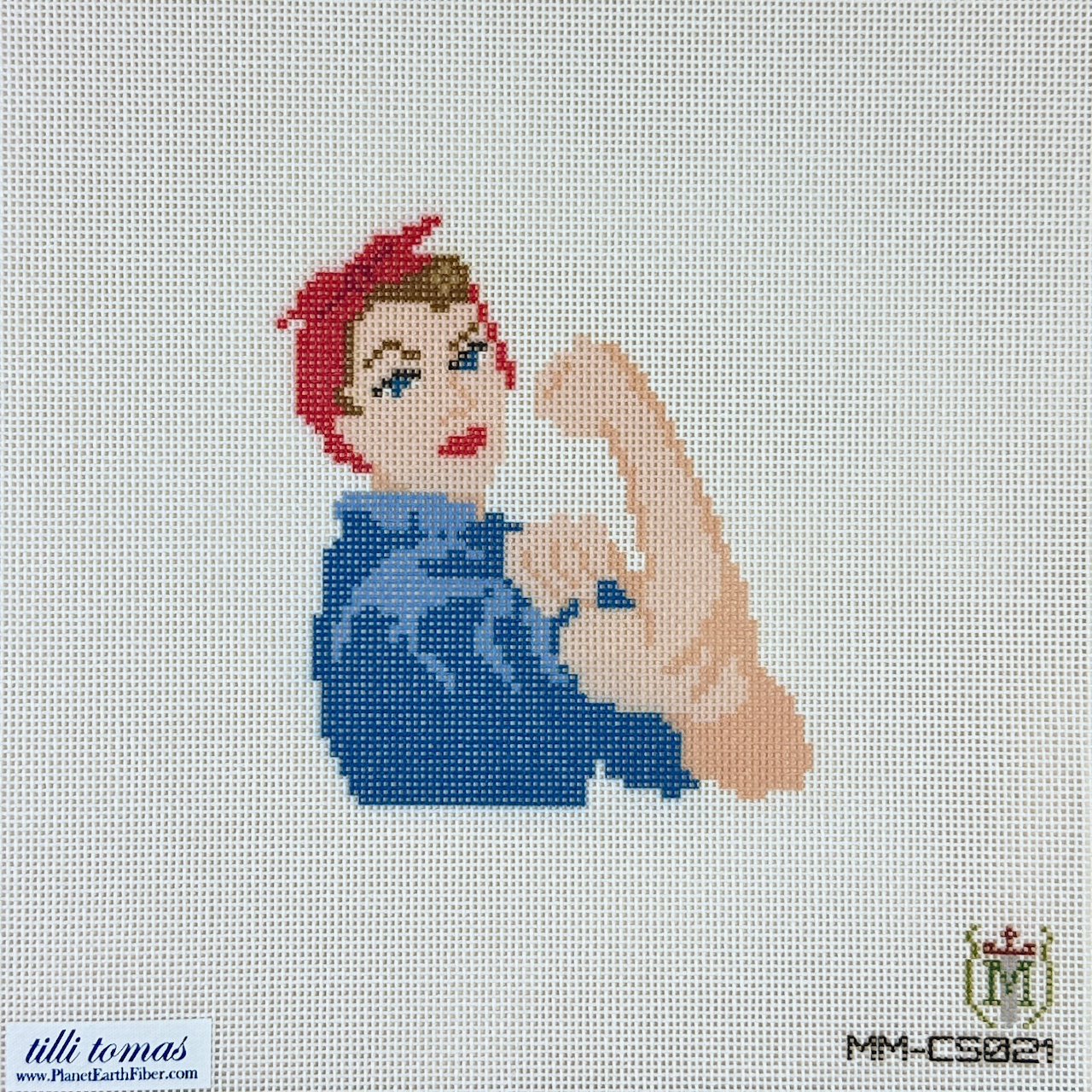 This is a printed needlepoint canvas by Misty Morrow for Tilli Tomas. It features the classic image of Rosie the Riveter.
