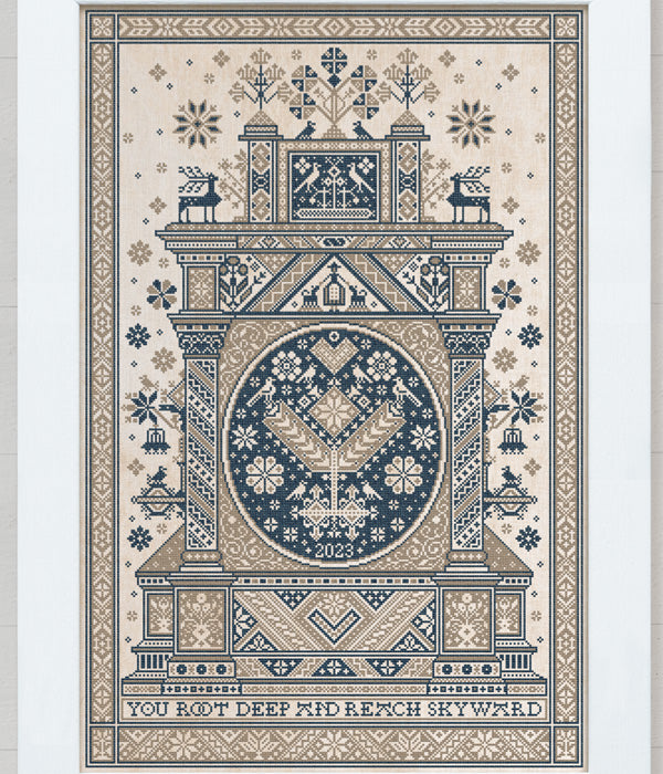 This is a printed cross stitch pattern by Modern Folk Embroidery. It features all 12 parts of Modern Folk's 2023 Stitch Along design. Reaching Skyward is an homage to the Tree of Life found on Frisian samplers. It is stitched with full cross stitches and is suitable for aida, linen, and evenweave fabrics.