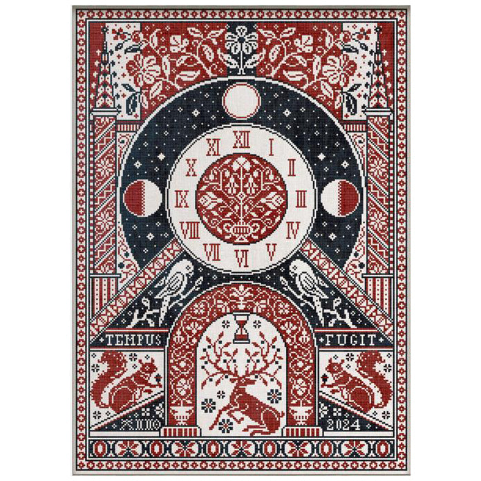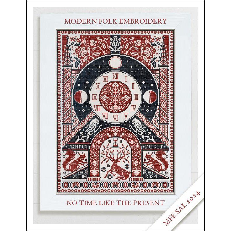 This is a printed cross stitch pattern by Modern Folk Embroidery. It features all 10 parts of Modern Folk's 2024 Stitch Along design and is a reflection on the passing of time, including a central clock surrounded by animal and pattern motifs. It is stitched with full cross stitches and is suitable for aida, linen, and evenweave fabrics.