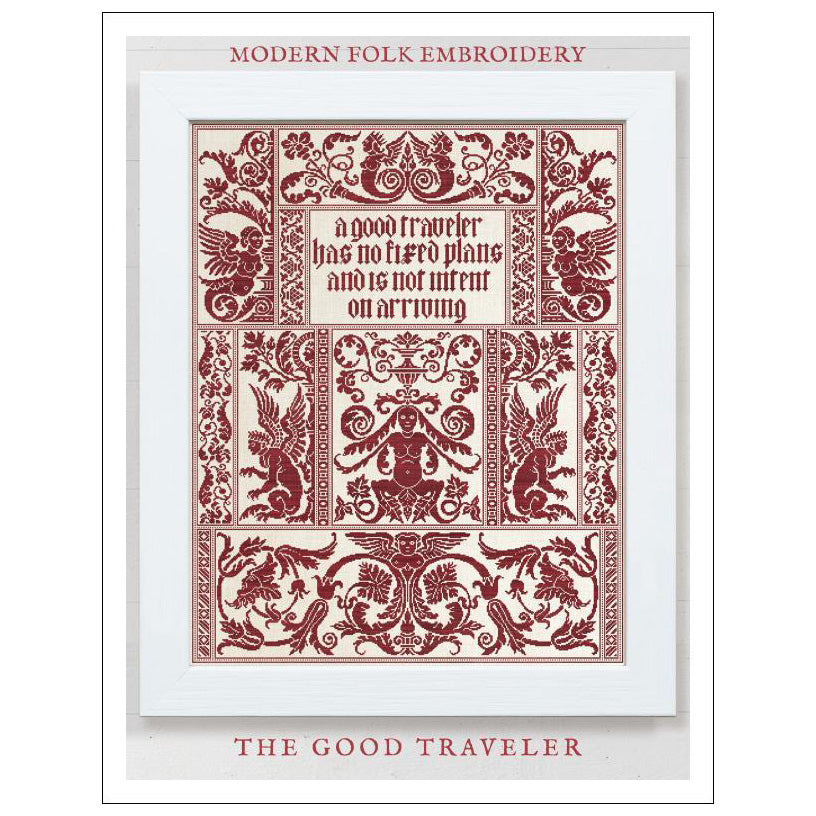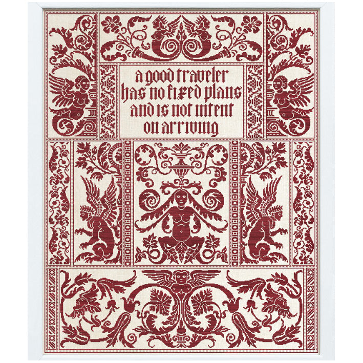 This is a printed cross stitch pattern by Modern Folk Embroidery. It features elaborate ornamental patterns inspired by a Renaissance pattern book by Peter Quentel, surrounding the text "a good traveler has no fixed plans and is not intent on arriving" quoted from Lao Tzu. The example as stitched uses one floss color and is stitched on Porcelain linen.