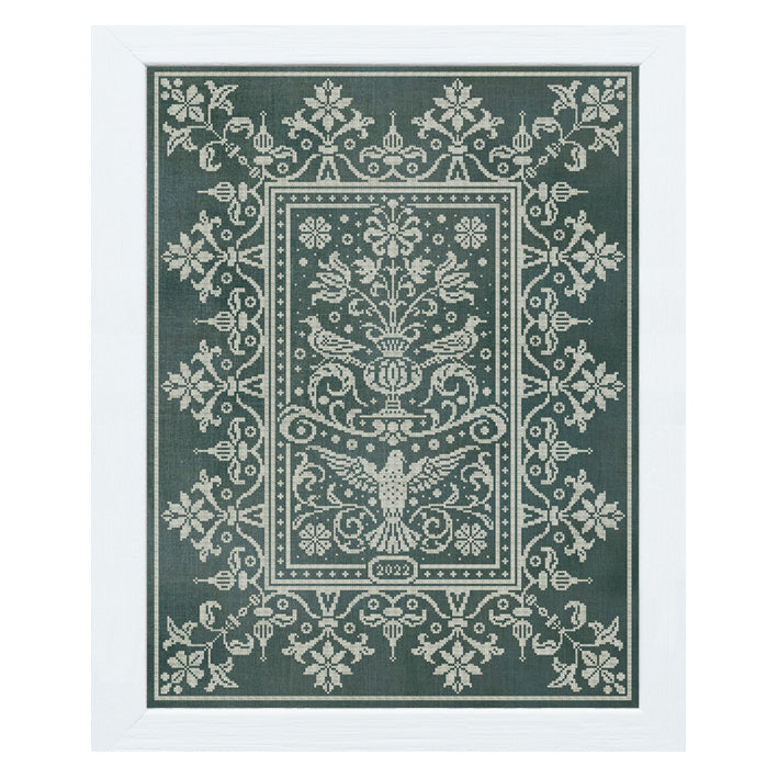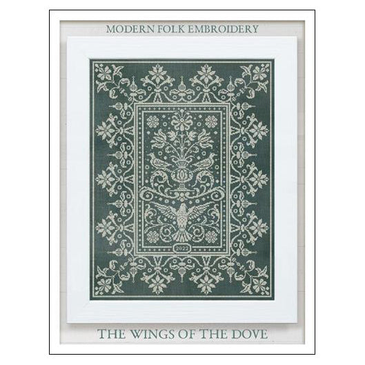 This is a printed cross stitch pattern by Modern Folk Embroidery. It features elaborate ornamental patterns, surrounding a flower pot and dove, inspired by the early Baroque pattern books of Bartolomeo Danieli and Isabella Catanea Parasole.