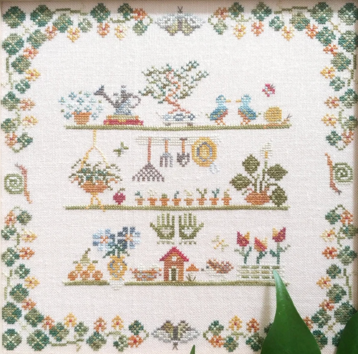 The Mojo Stitches In The Greenhouse Cross Stitch Pattern features three shelves filled with plants and gardening tools, creating a cozy, nature-inspired scene. Perfect for cross stitchers who love gardening and greenery.